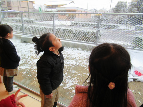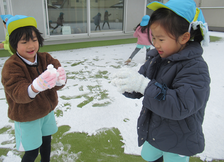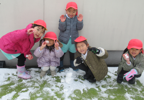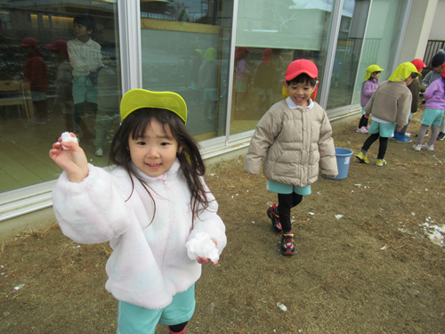 登園すると窓の外ワクワクした様子で眺めたり、「せんせい、雪合戦しよー」と遊ぶのを楽しみにしていました![]()