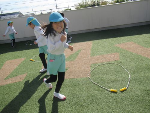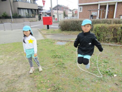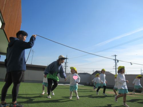 きりん組さんとぱんだ組さんでは、体操教室でなわとびをやり出したこともあり、今、なわとびブームがきています😊