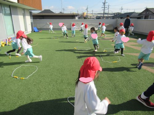 ながーい大繩の下をくぐって走ったり、大繩の上をうさぎさんのようにぴょんぴょんジャンプで跳ねて走ったりして身体をいっぱい動かして楽しみましたよ😊💖