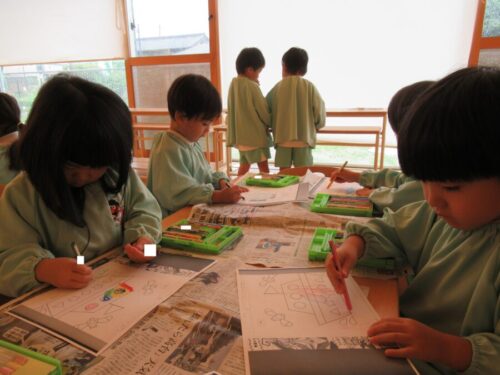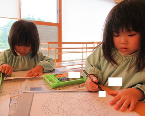 昨日に続いて、今日も雨☔ 楽しみにしていたプールが中止になって残念そうな子どもたちでしたが、雨の日の遊びで、ぬりえを準備すると、張り切って塗っていました😍