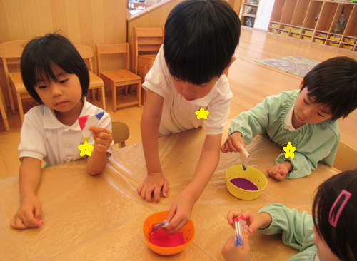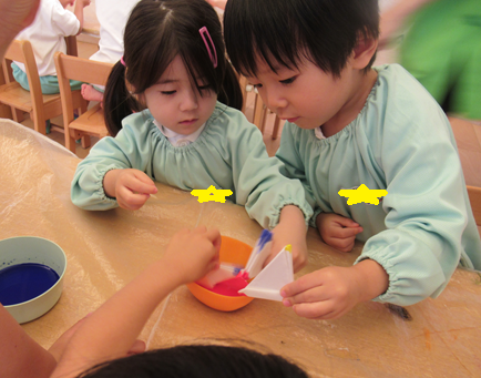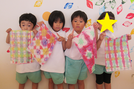 染めた紙を広げ、紙が染まった様子を「きれいだね!」と楽しみました