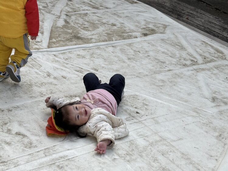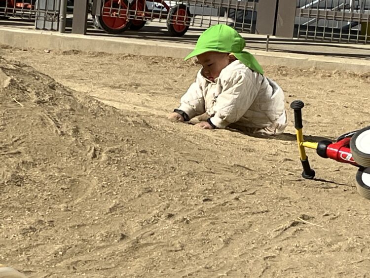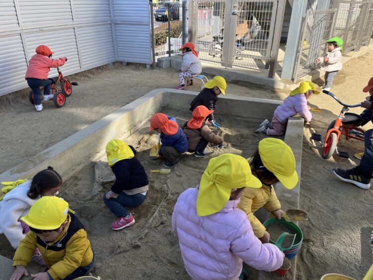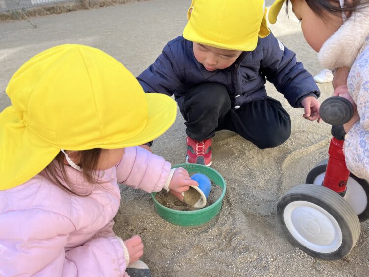 お砂場ではお山をみんなで作っていて「先生見て」と言っている子、カップに砂を入れてお店屋さんをしていました![]()