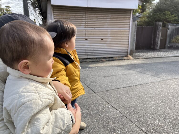 保育士と繋いで歩き、幼稚園バスを見に行ったよ![]()