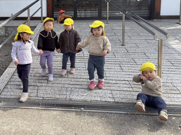 立春が過ぎ、昨日今日と暦の上だけではなく、春がやって来たかの様なポカポカ陽気でした。うさぎ組、あひる組、ひよこ組で舎利殿に出かけました。