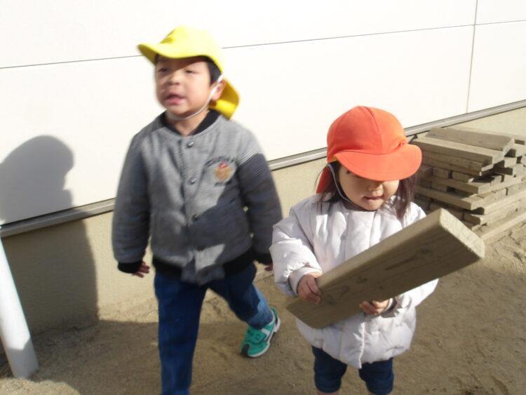 木の板で遊んでいたお友達は手押し車の駐車場を作ったり、お家を作ってままごと遊びをして遊んでいました🏠