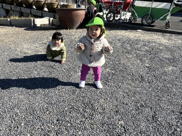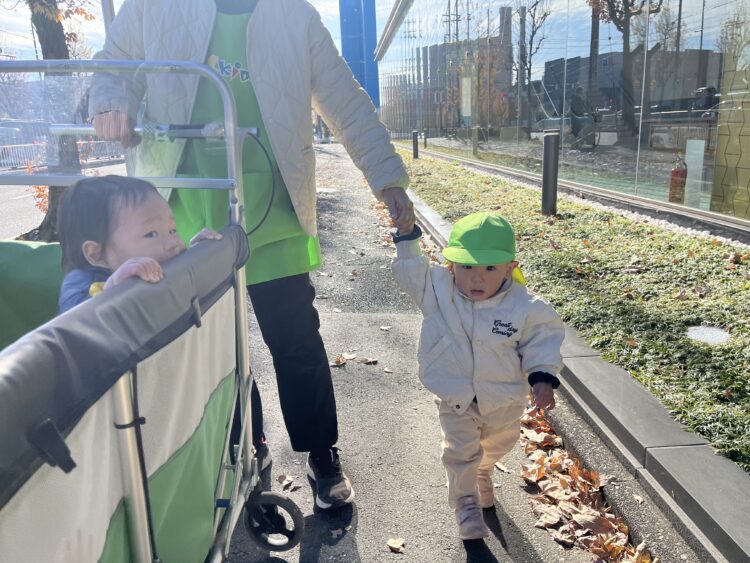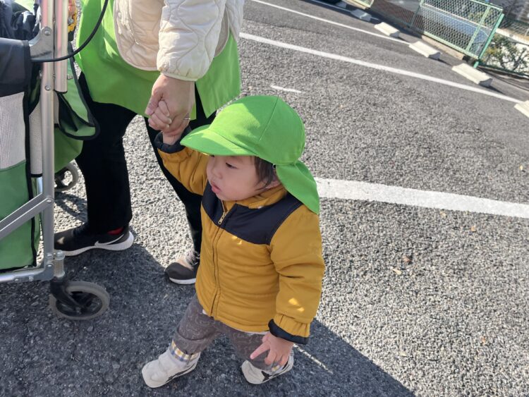 歩けるようになった子は、最後まで保育と手を繋歩いていました