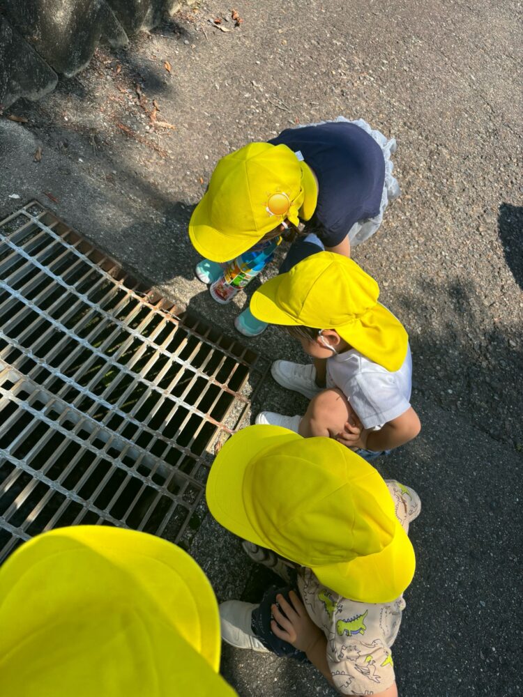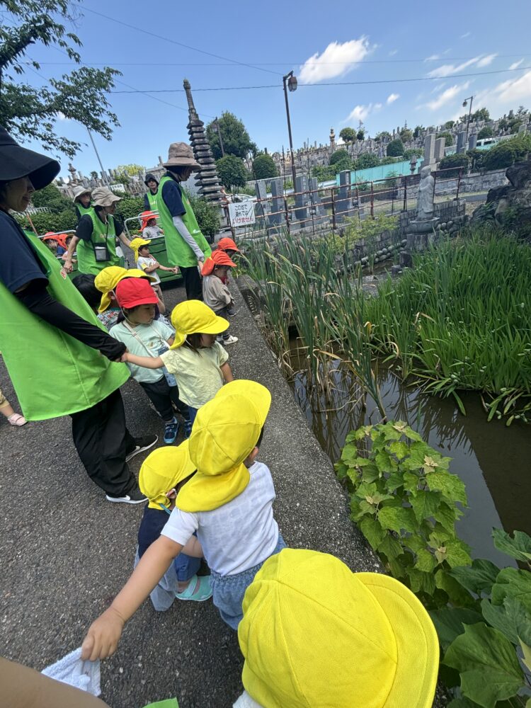 池を眺めて「お花咲くかな?」「お魚いるかな?」と思い思いに話す子どもたちです。