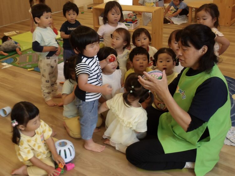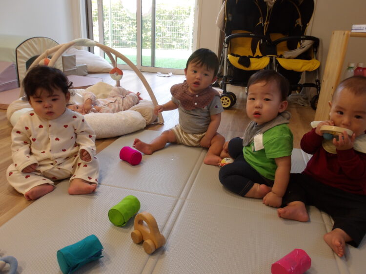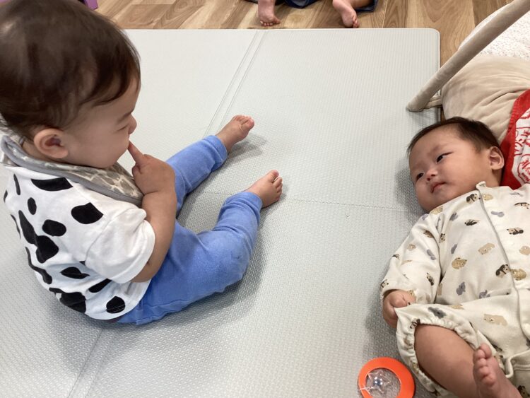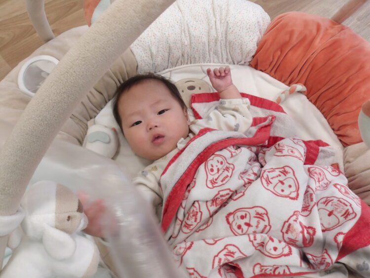はじめはなんだろうと思ったのか、ジーと見ていたのですが、保育士が触っているの見てちょっと気になったみたいでした![]()