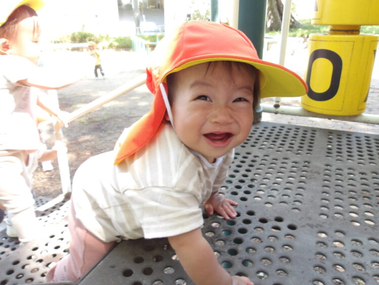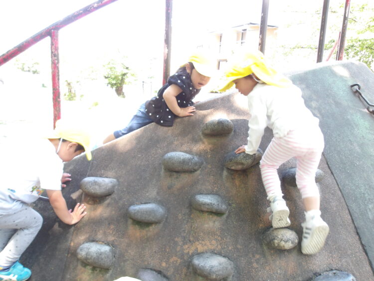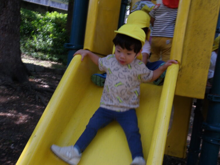 初めは「せんせーい!降りる…」「こわーあい」と泣けてしまったり、途中で終えてしまったりする子もいましたが、1、2回保育士に手伝ってもらって登ってシューっと降りるのをすると、自分たちで登って降りるのが楽しくなり何度も挑戦する姿がありました!!
