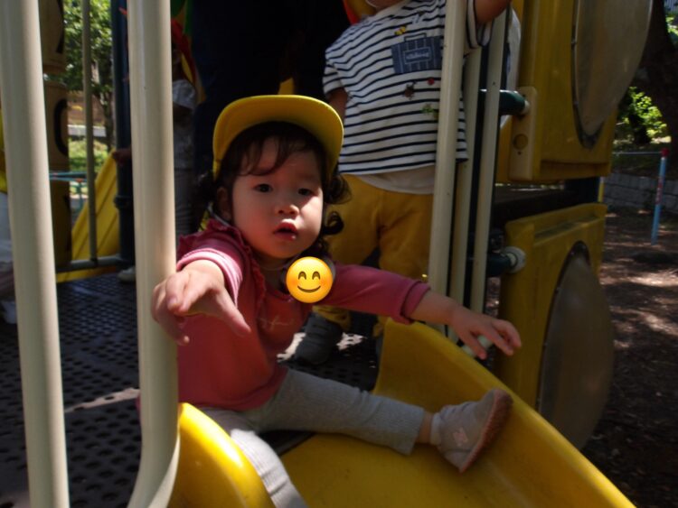 小さな滑り台🛝に自分で登ってシューっと滑るのにハマり、何度もチャレンジ!!![]()