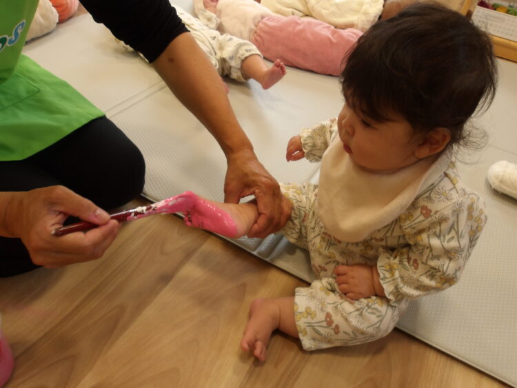 足に絵の具をつけると「何これ」と言った顔をしていました