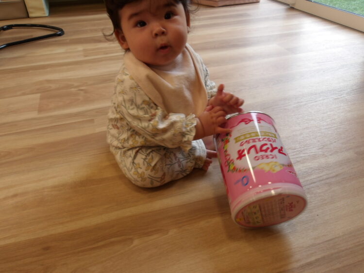 ミルク缶を転がしたり、持って見たりして遊んでいました