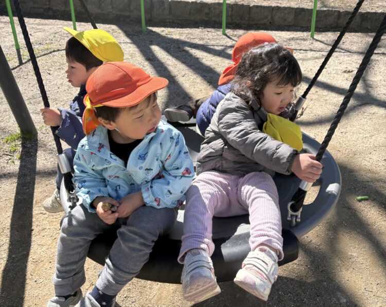 丸型のブランコで遊んだり、山の遊具で遊んだり、滑り台で遊んだりと元気いっぱい遊ぶ姿が見られました☺️