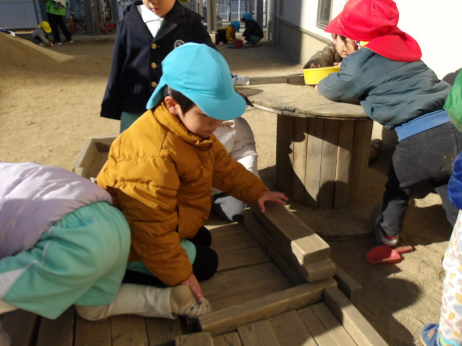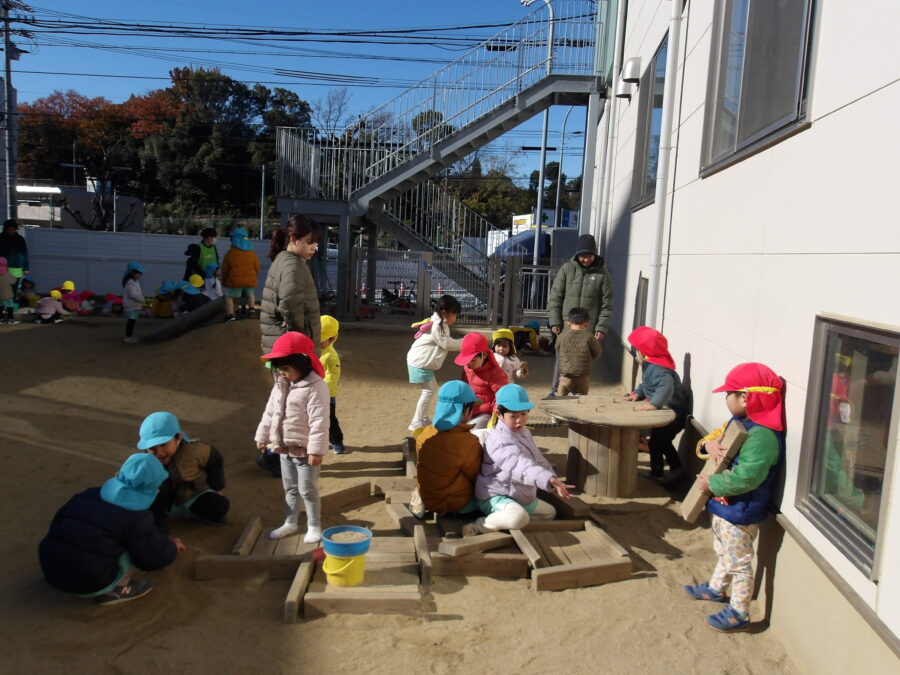 園から帰ると園庭に行き砂場や木材で楽しく遊びました![]()