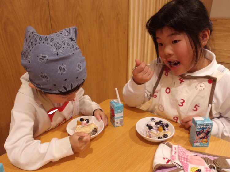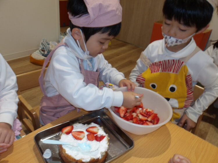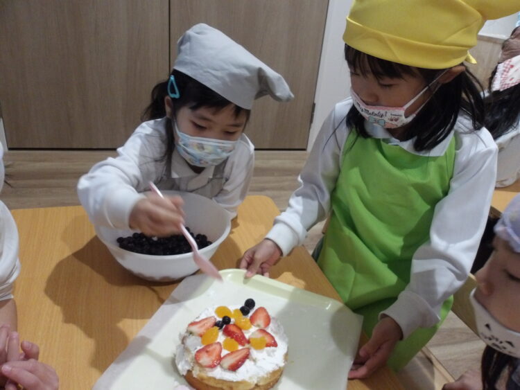 バディで力を合わせて、スポンジに生クリームやフルーツをのせ、