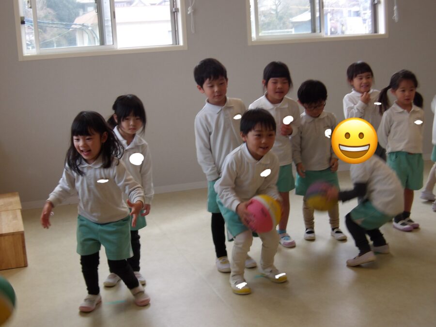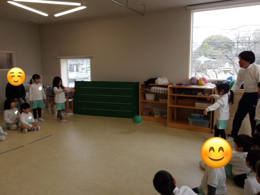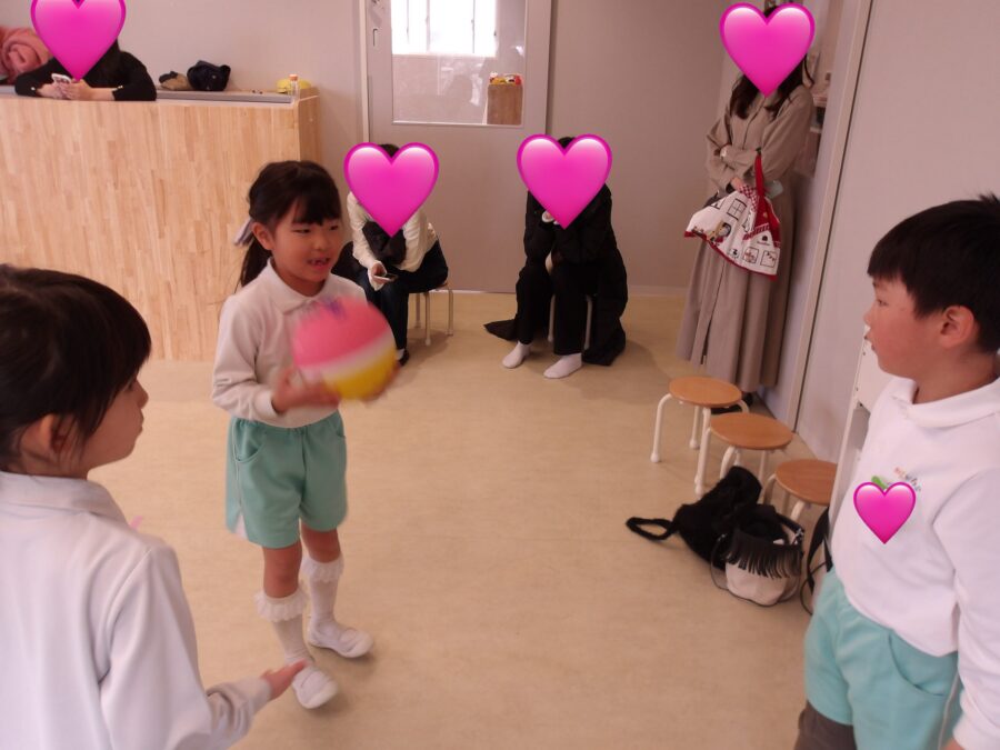 まずは5人チームを作りお友達にボールを投げ合っていました✨
