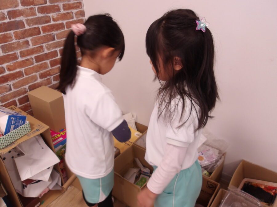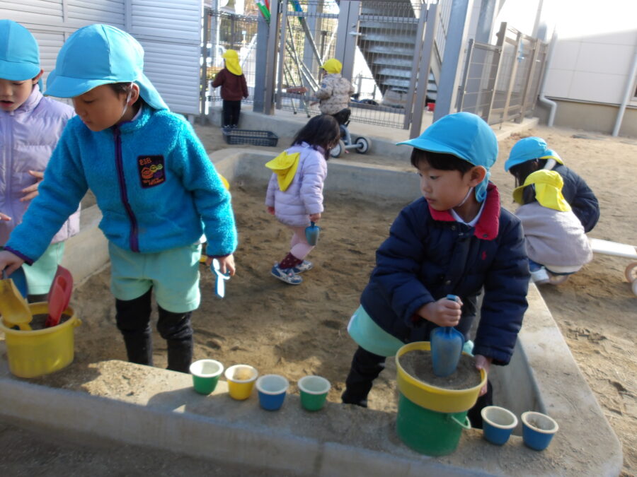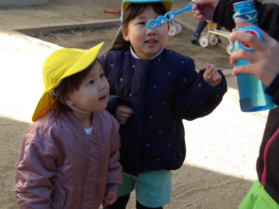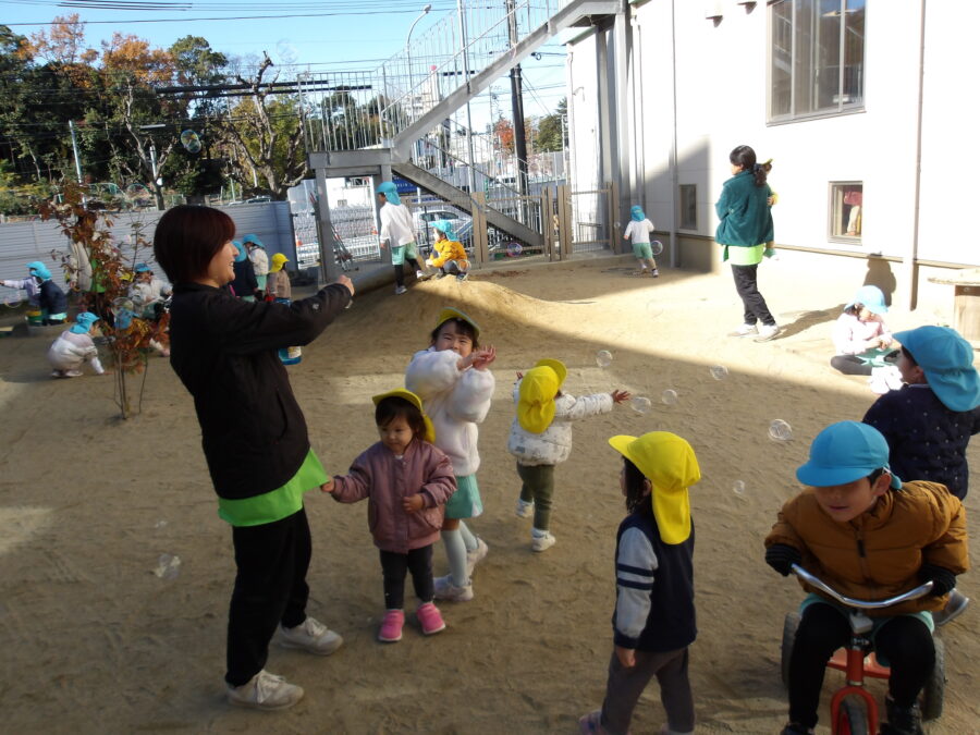 外遊びでは、小さなお友だちとかかわりながら一緒に遊びを楽しむ子、シャボン玉を楽しむ子、お砂場でカップに砂を詰めて並べて楽しむなど、みんな思い思いの遊びを楽しんで過ごしました