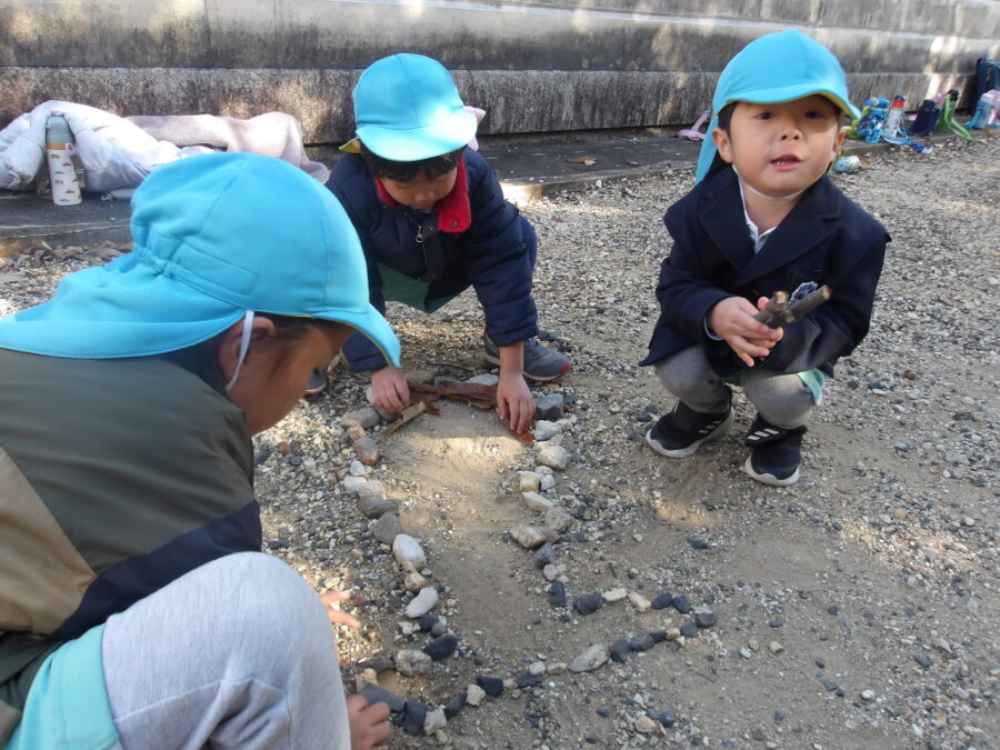 石を並べてごっこ遊びをするなどいろんな遊びをして