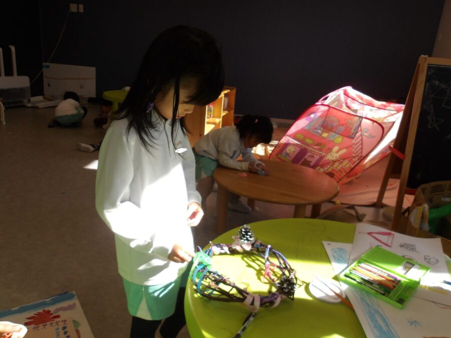 室内遊びではおもちゃ遊びの他、今日のリトルアーティスト展で展示されている作品を見たり、仕上げをして楽しむ子がいました