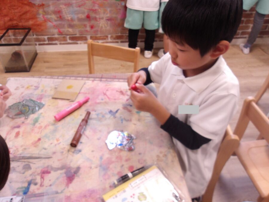 製作ではいろんな色の絵の具を使って絵を描いたり