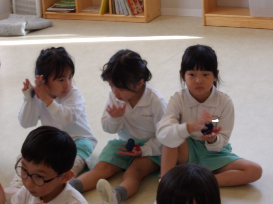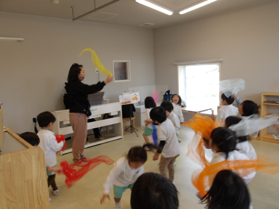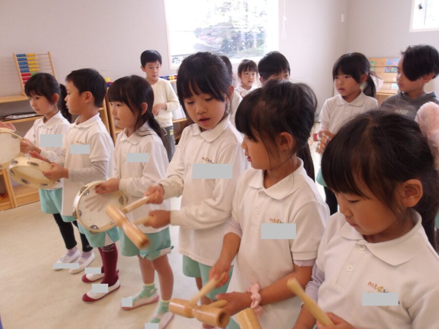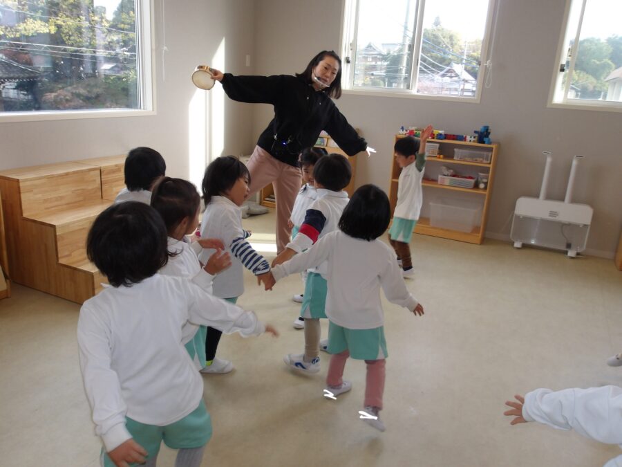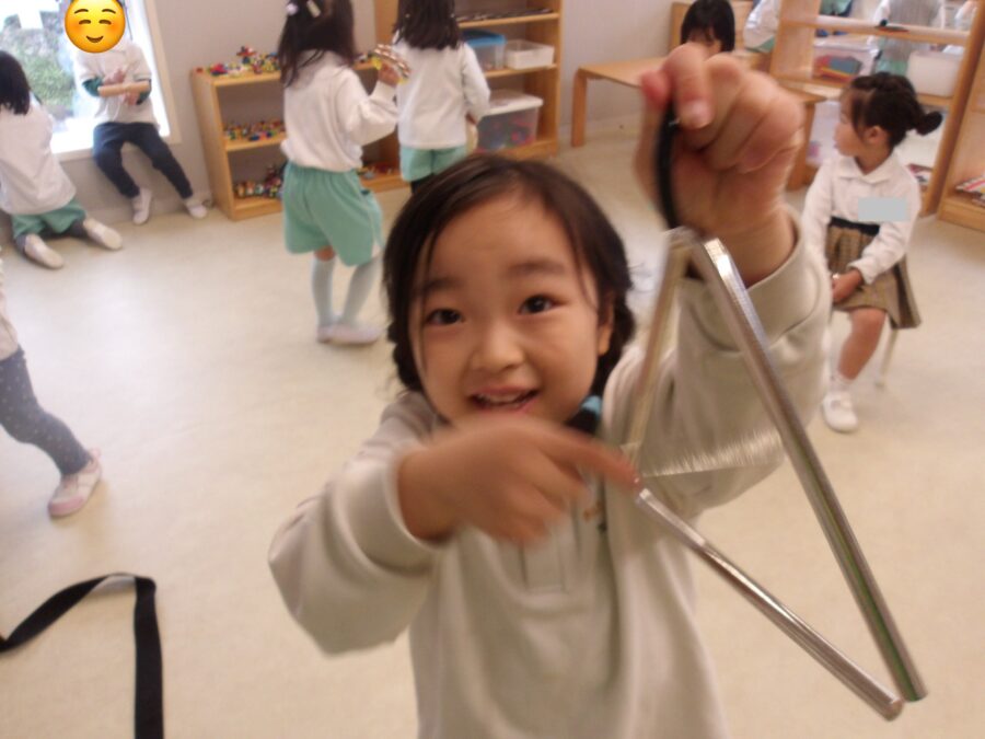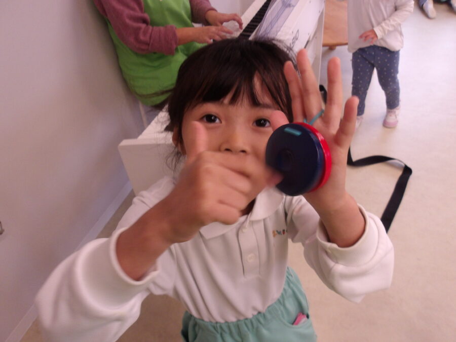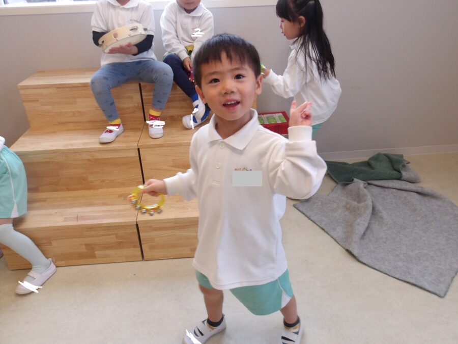 楽器遊びでは、タンバリンやウッドブロック、鈴などを使い、たたいて音が鳴るのを楽しんだり、先生のピアノに合わせて音を鳴らし遊びを楽しんでいました![]()