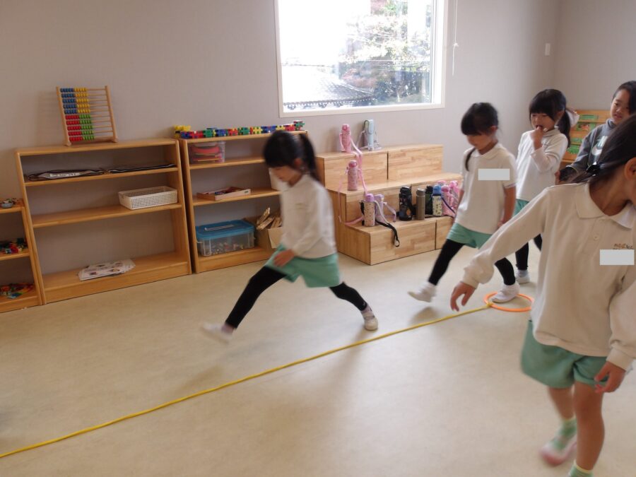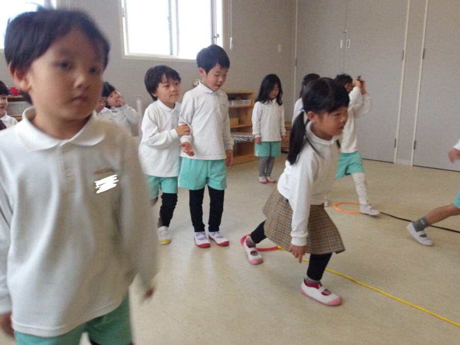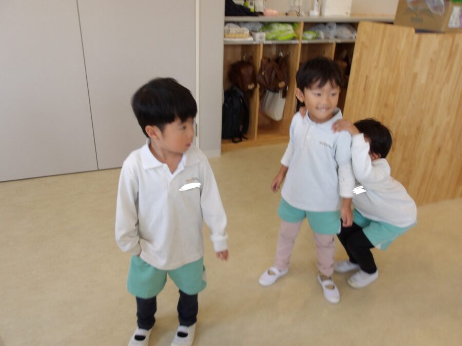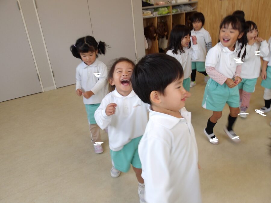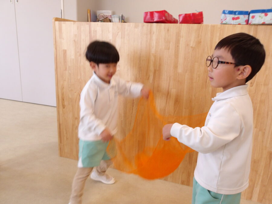 次に2人1組になって落ち葉を落とさないように端っこを持って運んだり、ゆらゆらしました🍂