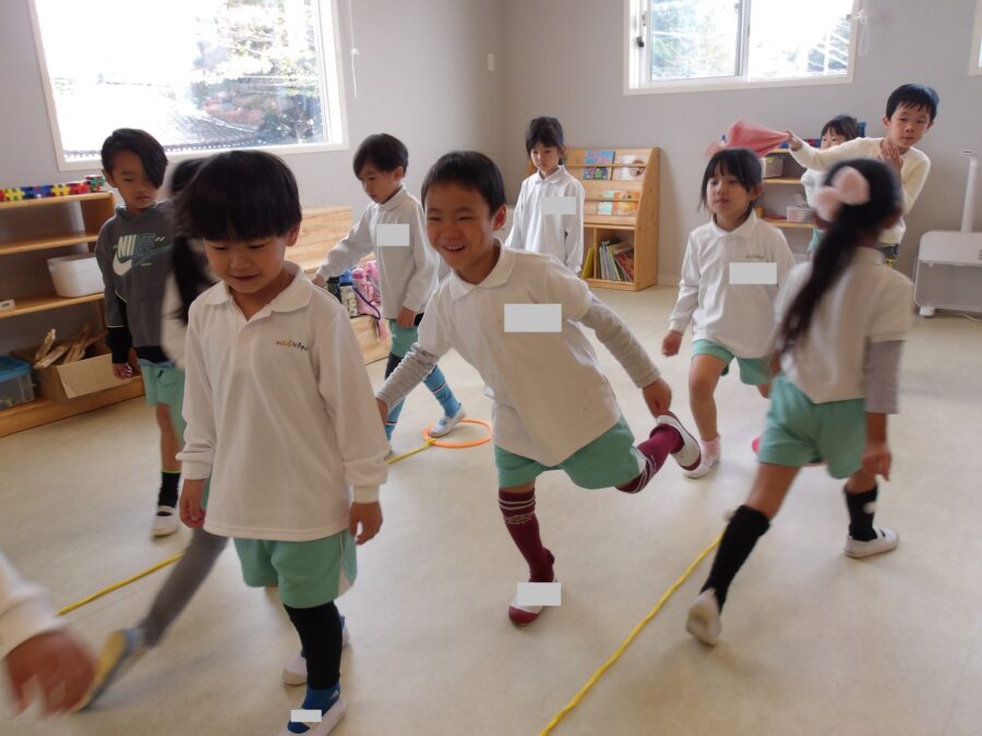 マットで前まわりをしたり、二人組になって手を繋ぎダブルおむすびになって