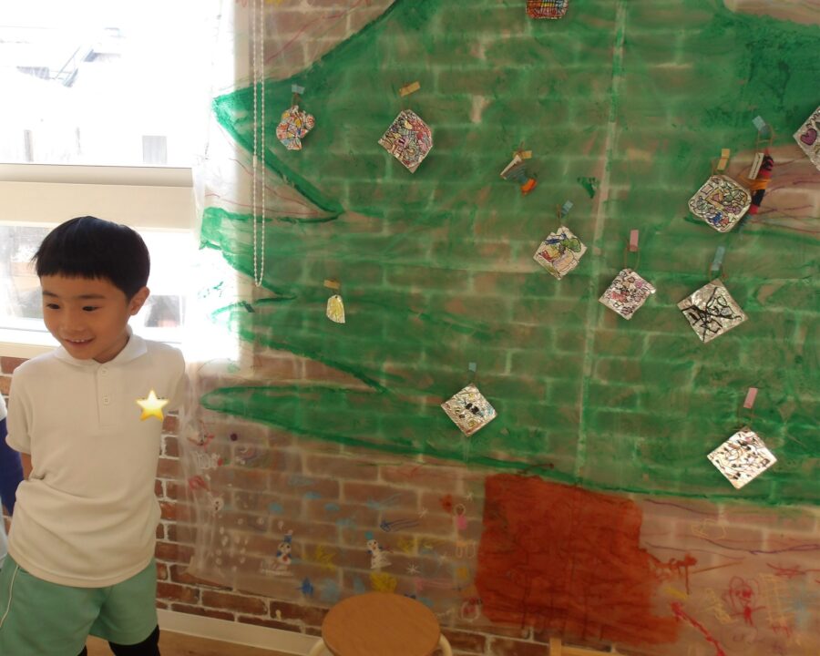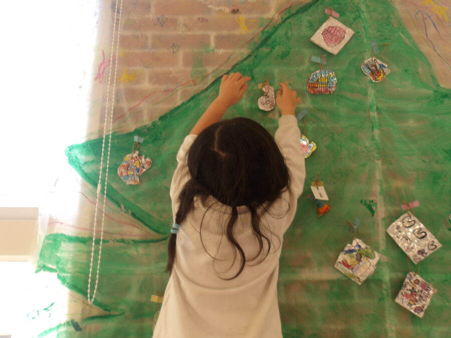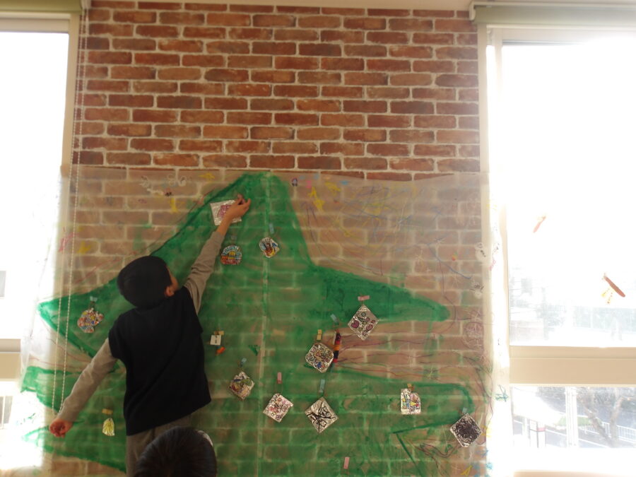 クリスマスツリーの壁面にオーナメントを作って飾りました![]()