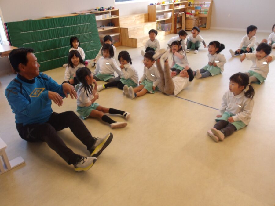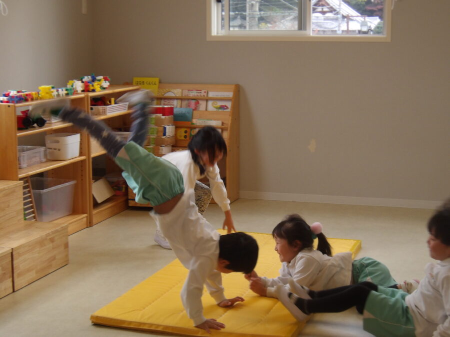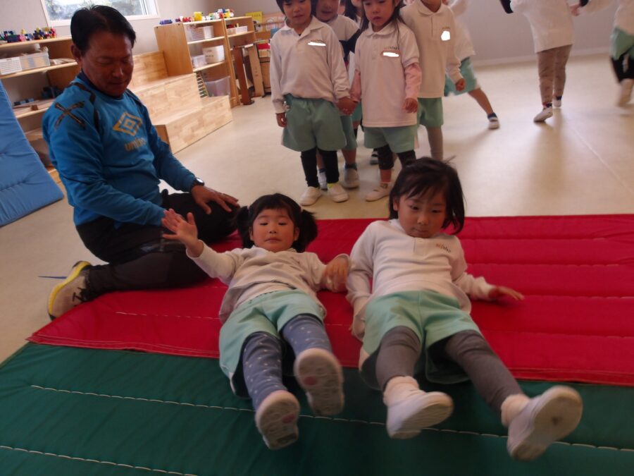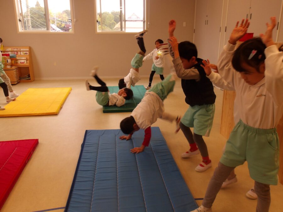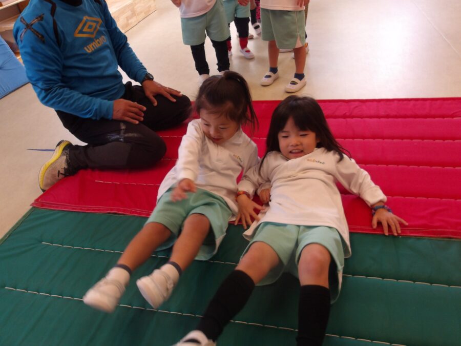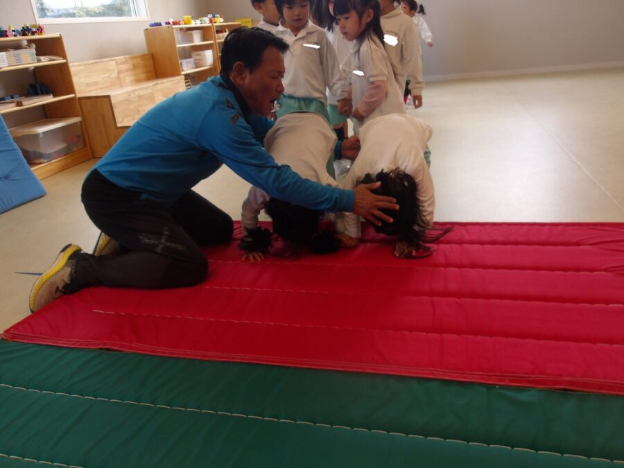 そら組さんは先生のお手本を見ながら、でんぐり返しに挑戦しました![]()