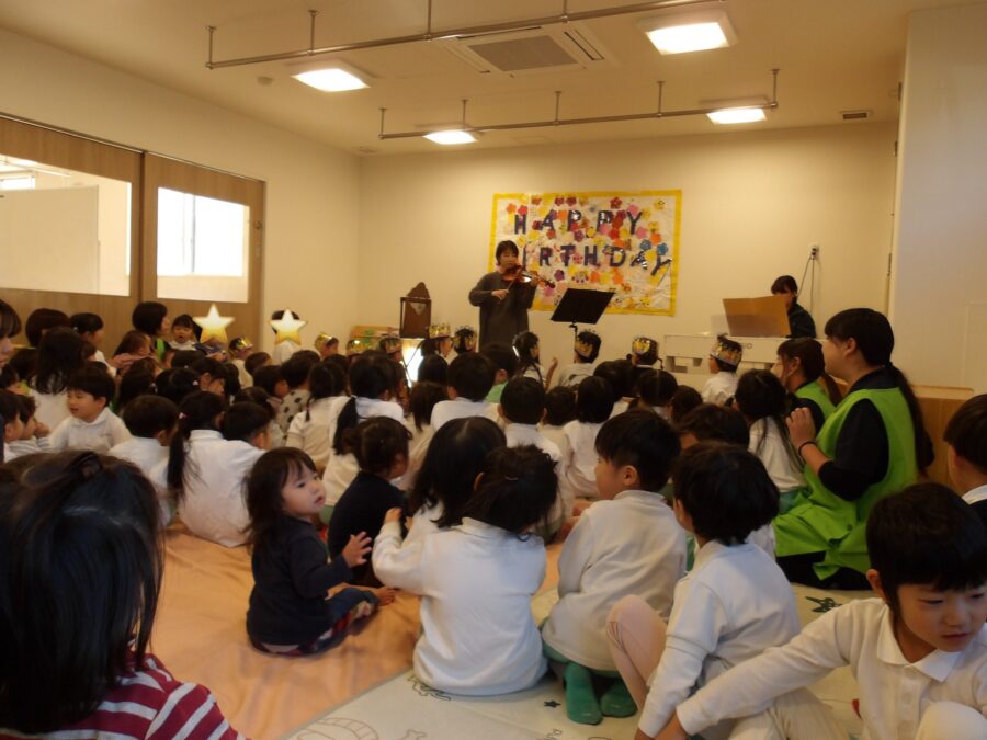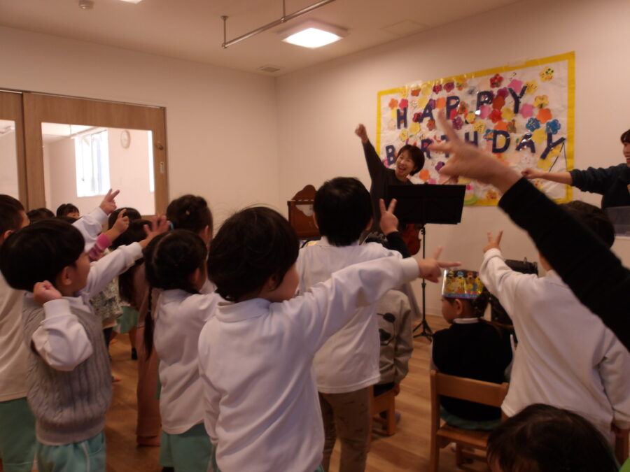 まずはバイオリン演奏を聴き、ピアノに合わせて手遊び曲を皆で歌いました!