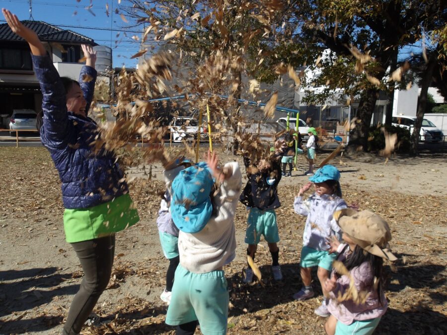 落ち葉を上に投げ葉っぱの雨をしていました🍂