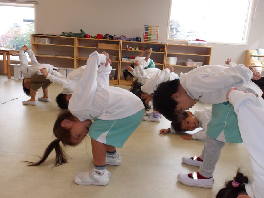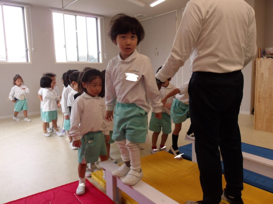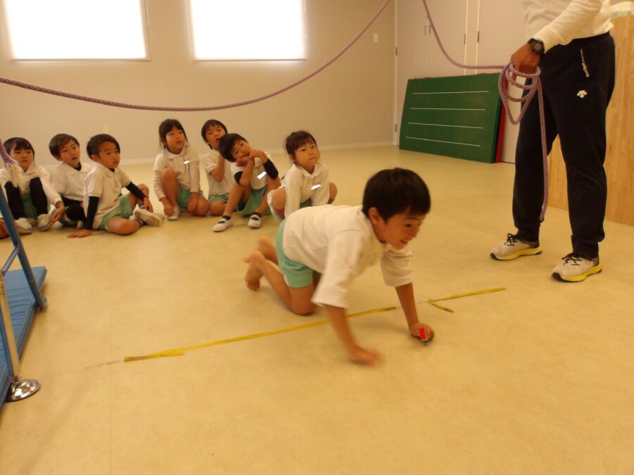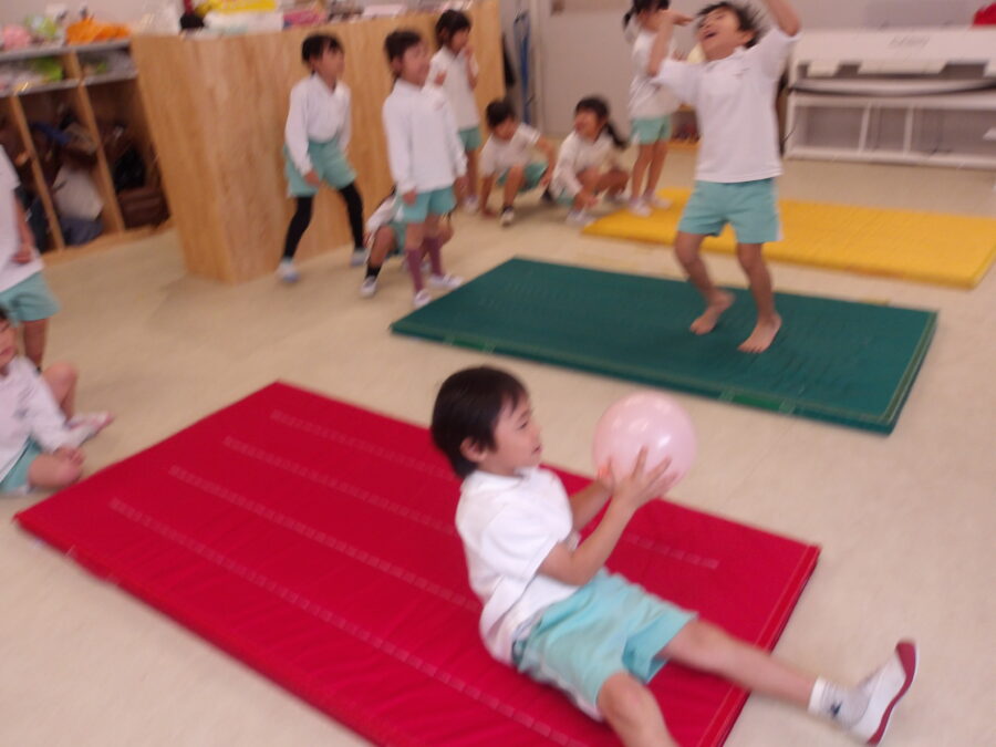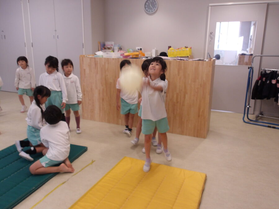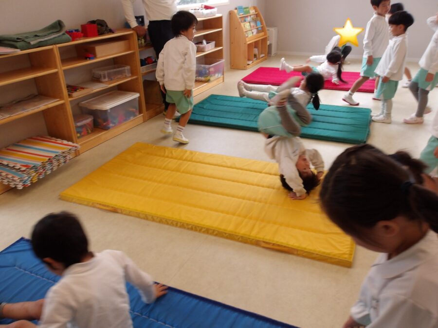 体操の先生にタイミングの取り方を教えてもらい、上手に飛ぶことができました🥰 ハイハイで下からとおれるかな〜🤭 最後は風船を上に投げ、まえまわりをしてキャッチするゲームをしました💪