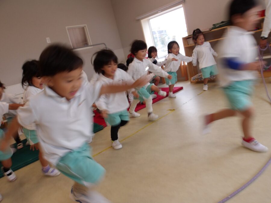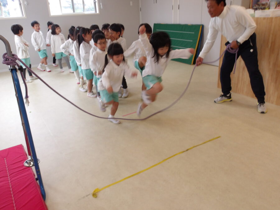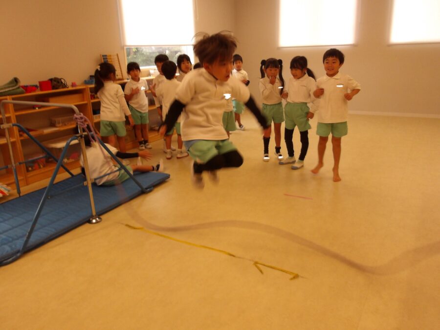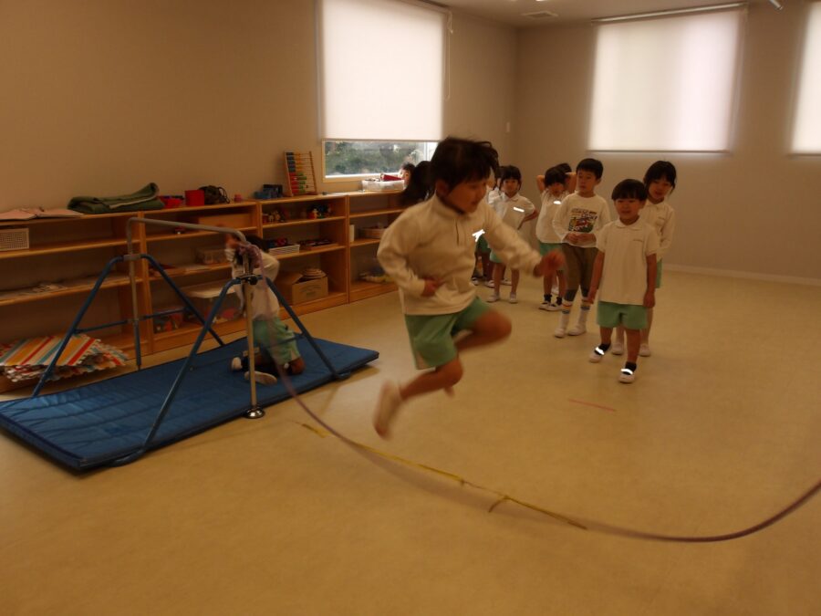 飛んでいない子はお友達の応援をしていました📣 次は4チームに分かれてまえまわりをしましたたいよう組さんは大縄の中でジャンープ!
