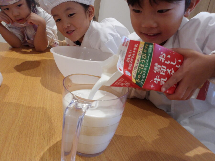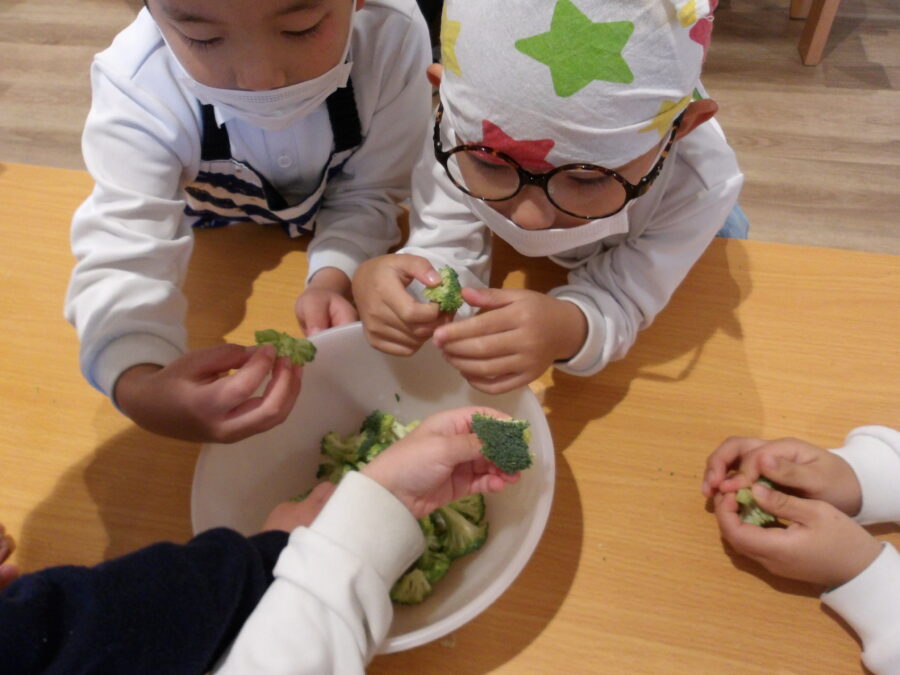 まずは先生と一緒にブロッコリーを切りました🥦 切ったブロッコリーを手でちぎり小さくしました 牛乳を測ります🥛