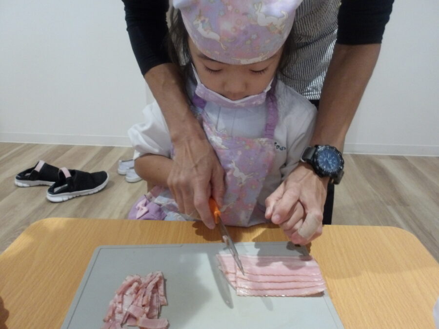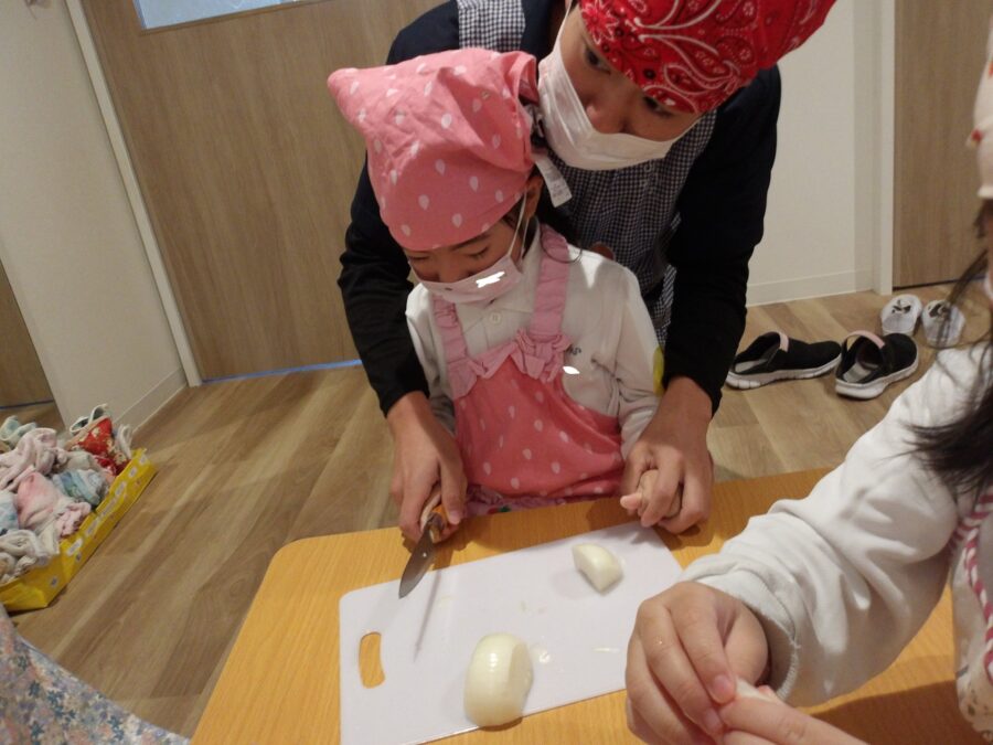 「これくらいかな〜?」「ストップ!!」とお友達と協力して測っていました😊まずは玉ねぎの皮をむきます!