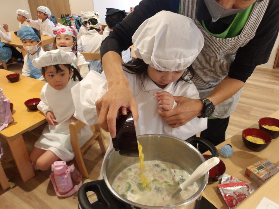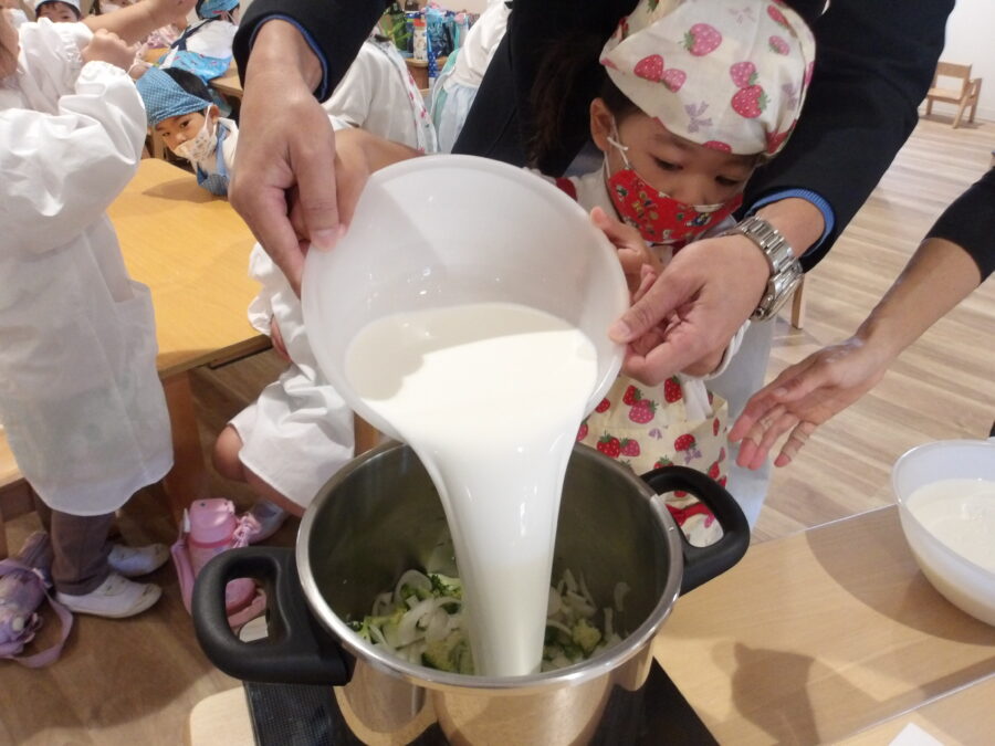 先生と玉ねぎも切りました🧅 ベーコンも切りました🥓 切った具材を鍋に入れ、牛乳を入れます🥛 どうなってるか気になって見に来てる子もいました🥰最後に粉末コーンスープを入れて、、、最後に混ぜたら完成!!! 元気よく「いただきまーす!」美味しくできて喜ぶ姿がありました🥰