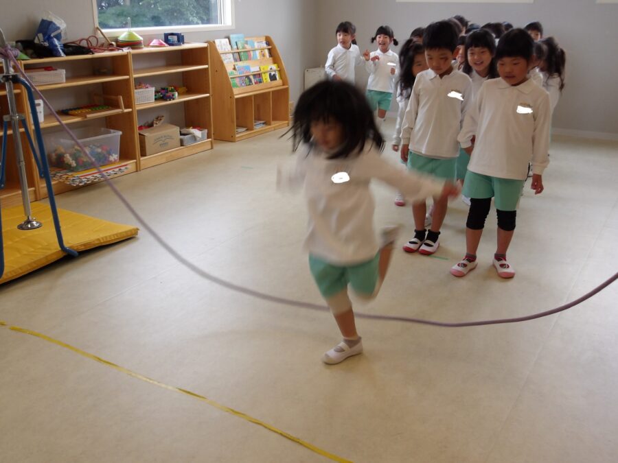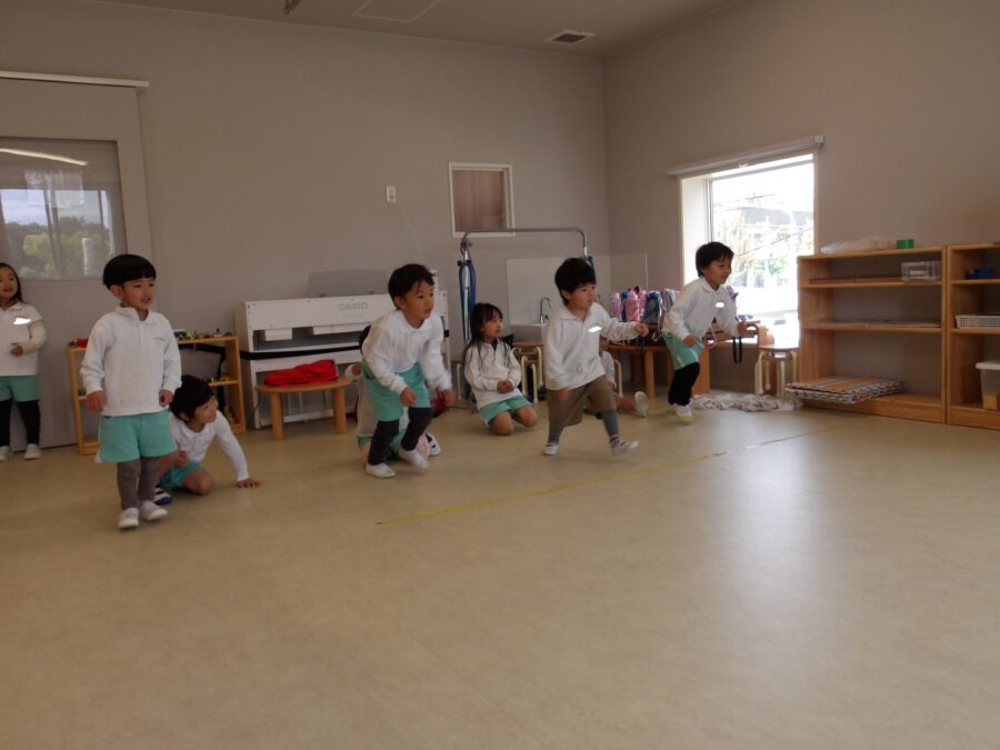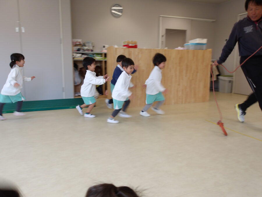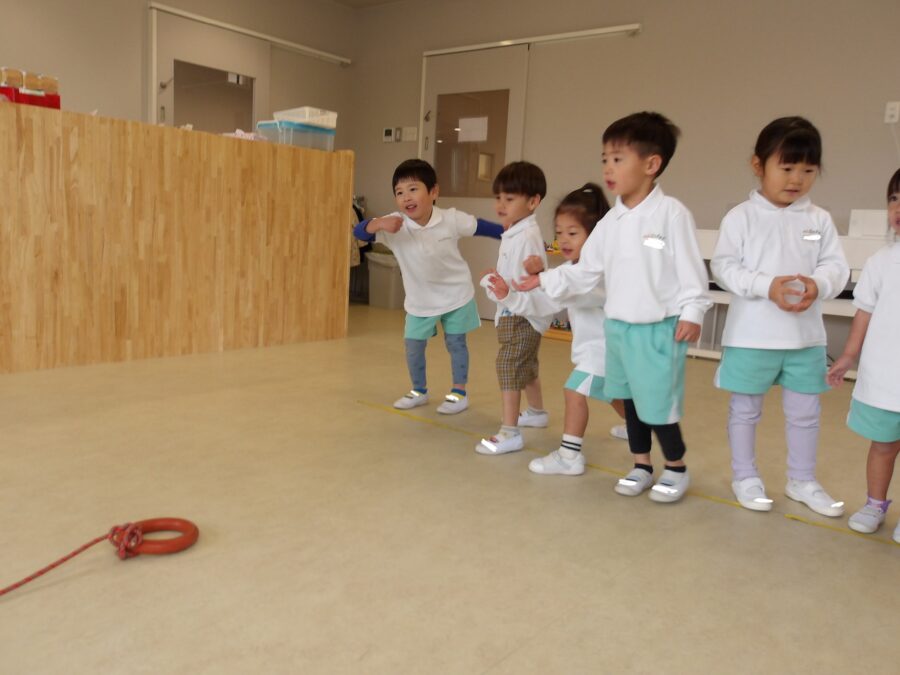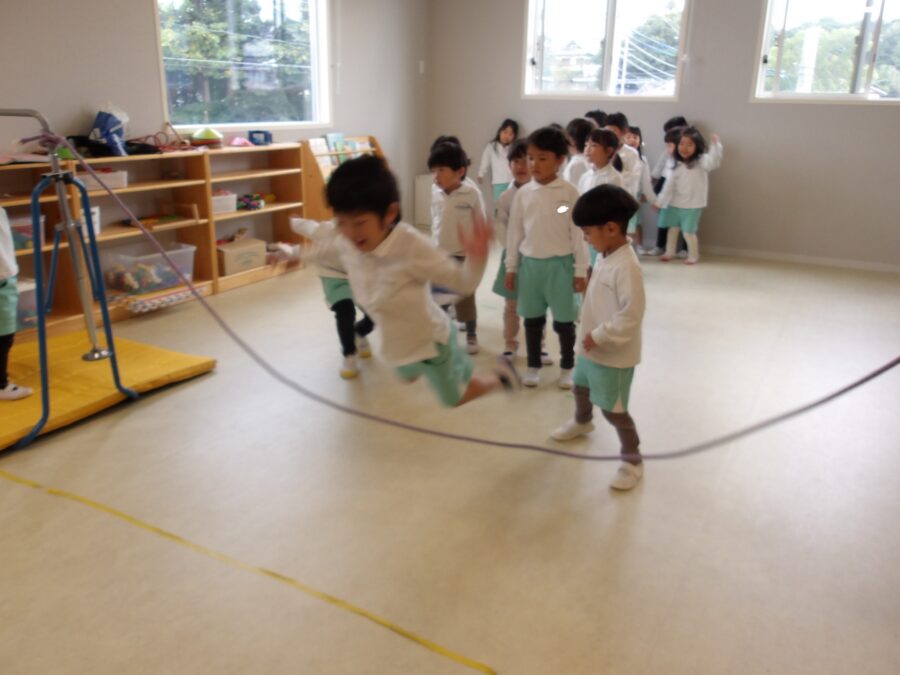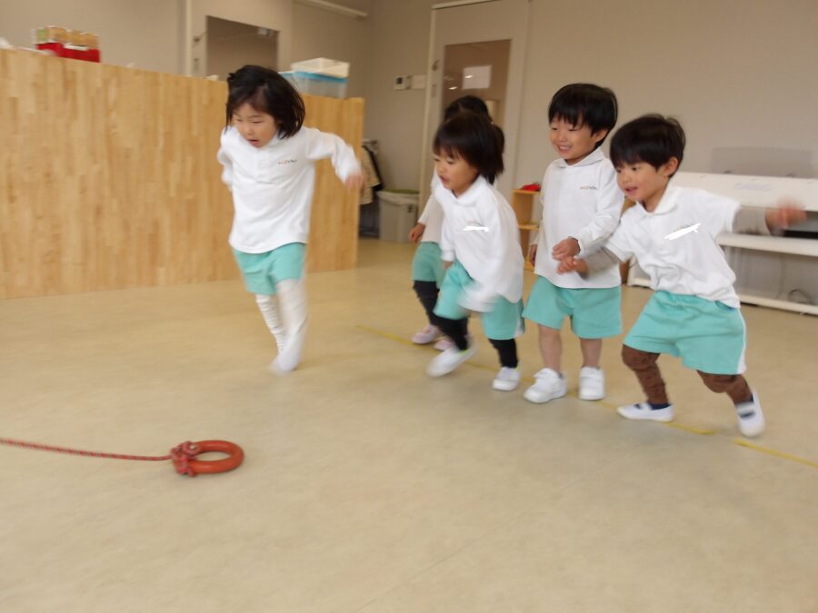 そら組さんはまずゴム跳びをしましたゴムの左右を両足跳びでジャン〜プ!!!2回目はスピードがはやくなり「難しい〜」と言う子もいました、、、