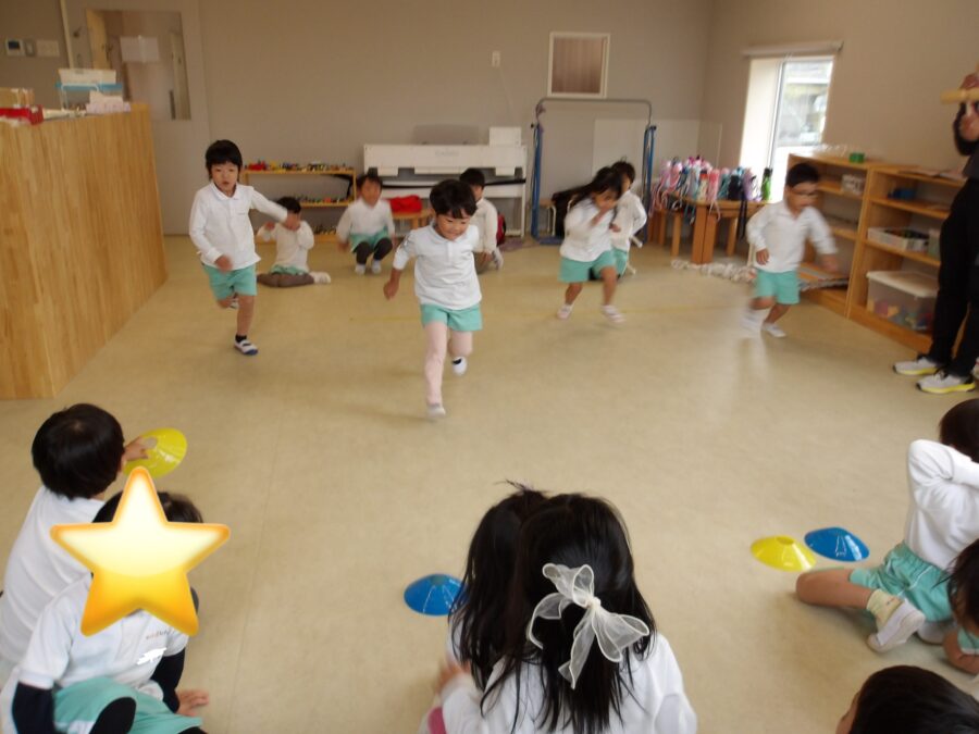 次は4チームに分かれて先生が持ってる輪っか付きの紐を追いかける「ネズミとり」をしていました🐀全力で捕まえに行ってました🥰 他のチームがやっている時は友達の応援をする姿もありました😊 にじ組さんは前にある2色のコーンを取りに行く「爆弾ゲーム」をしました💣