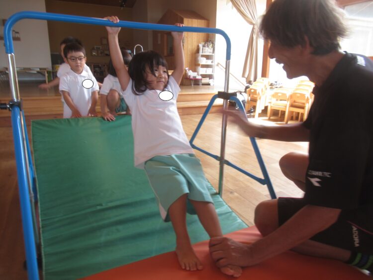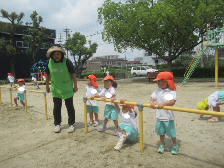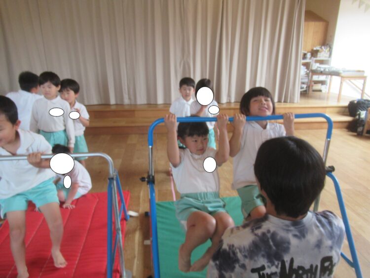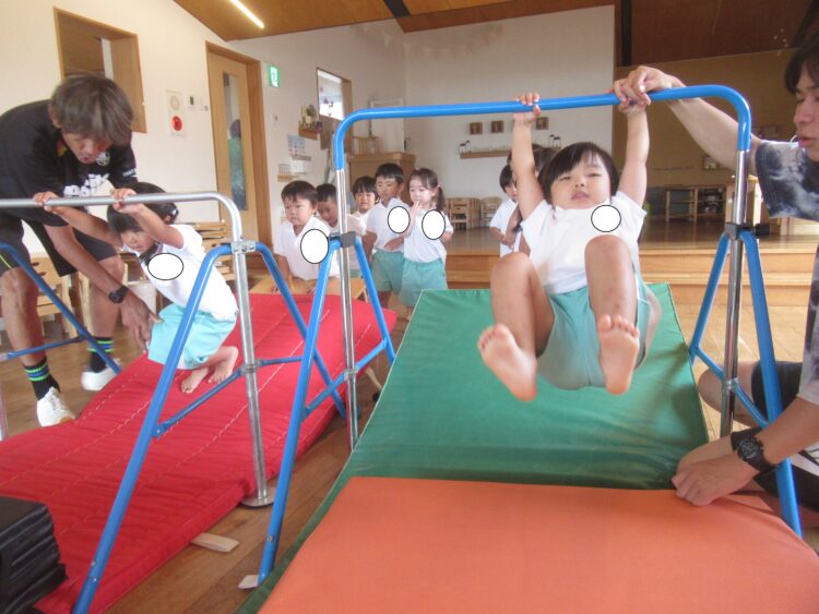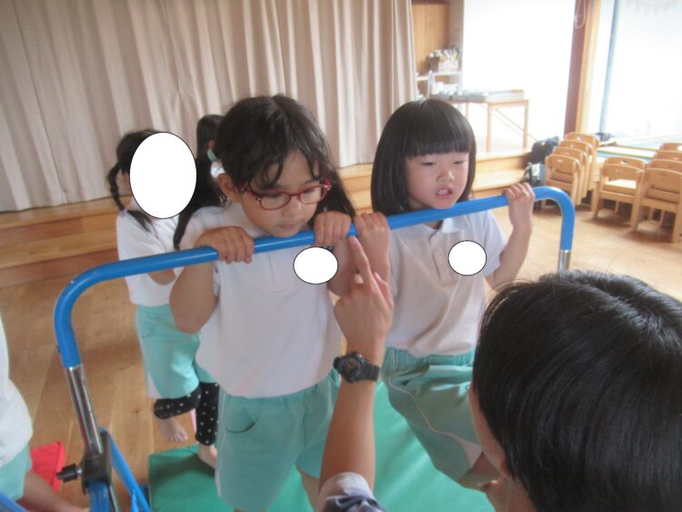 鉄棒の上に顎を乗せながら足をあげる姿勢をキープ!
