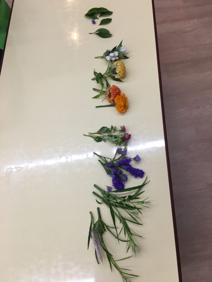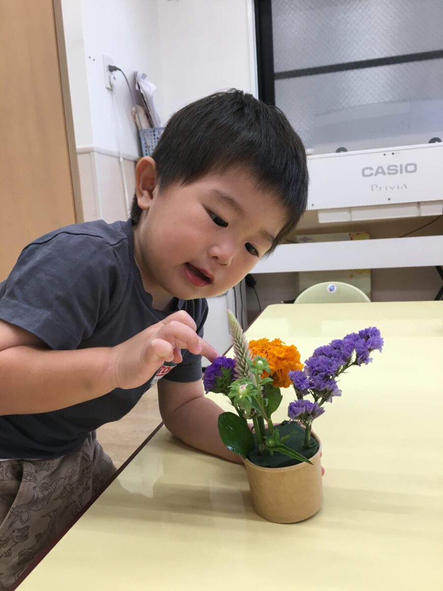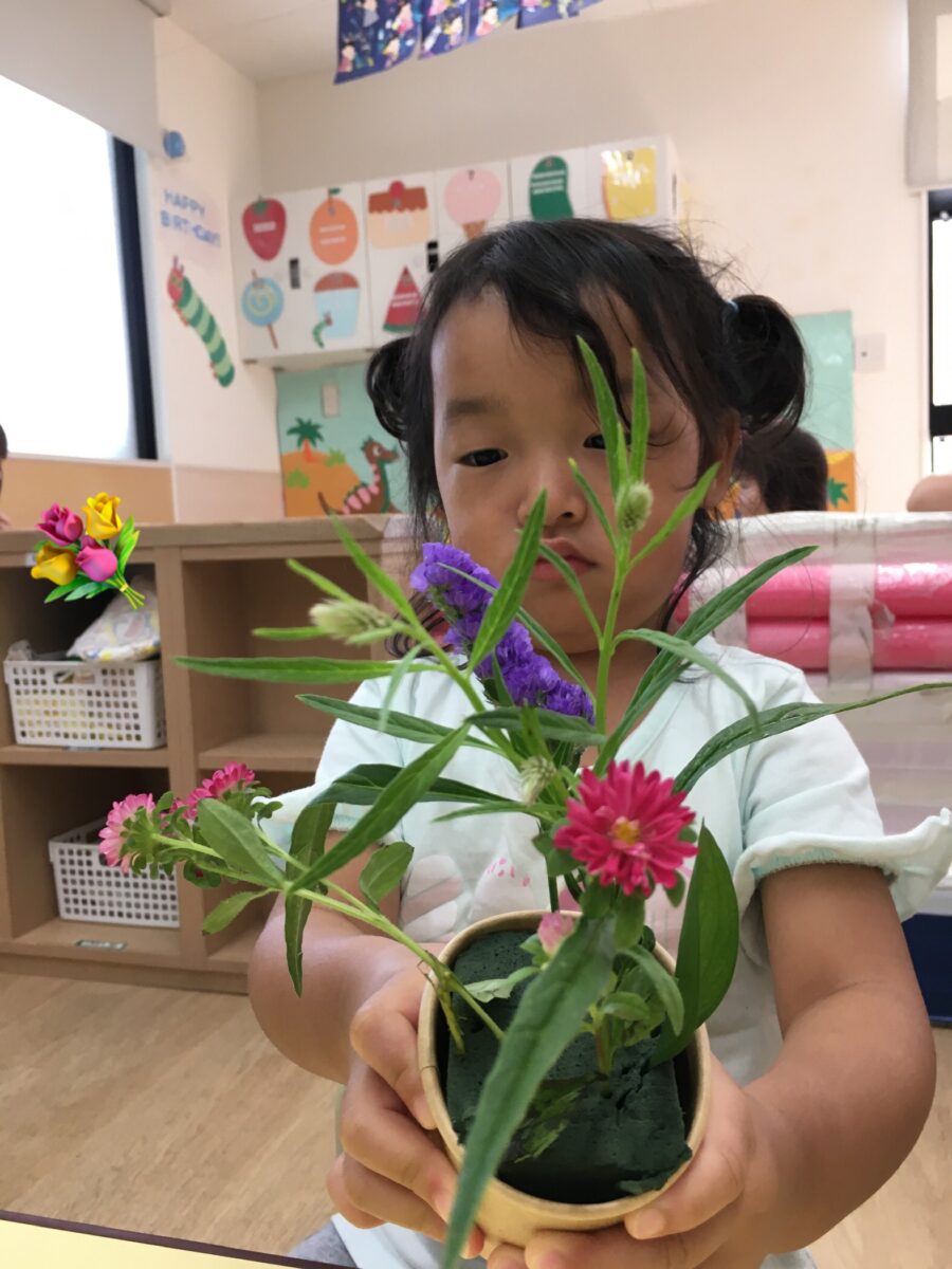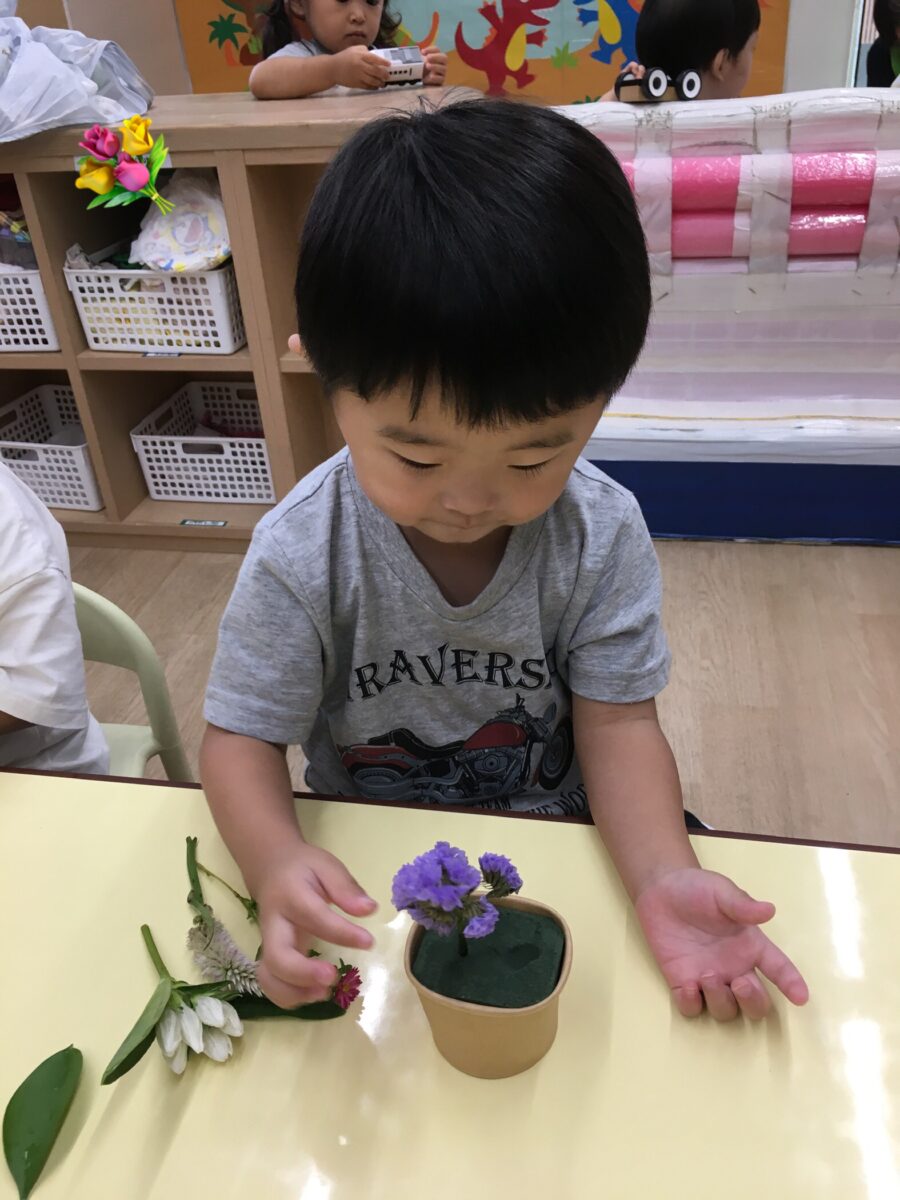 どの花をどこに刺すかを試行錯誤しながら、自分なりに彩っていました。