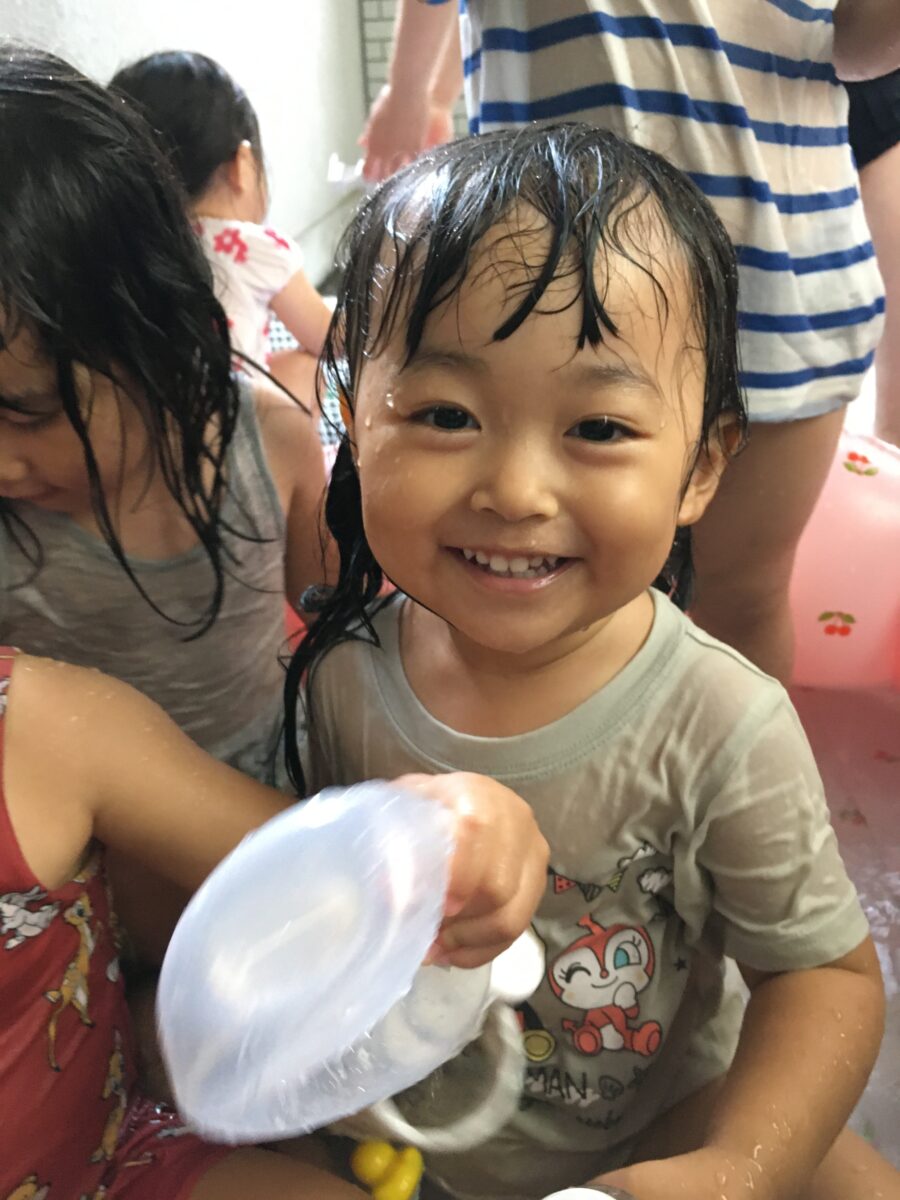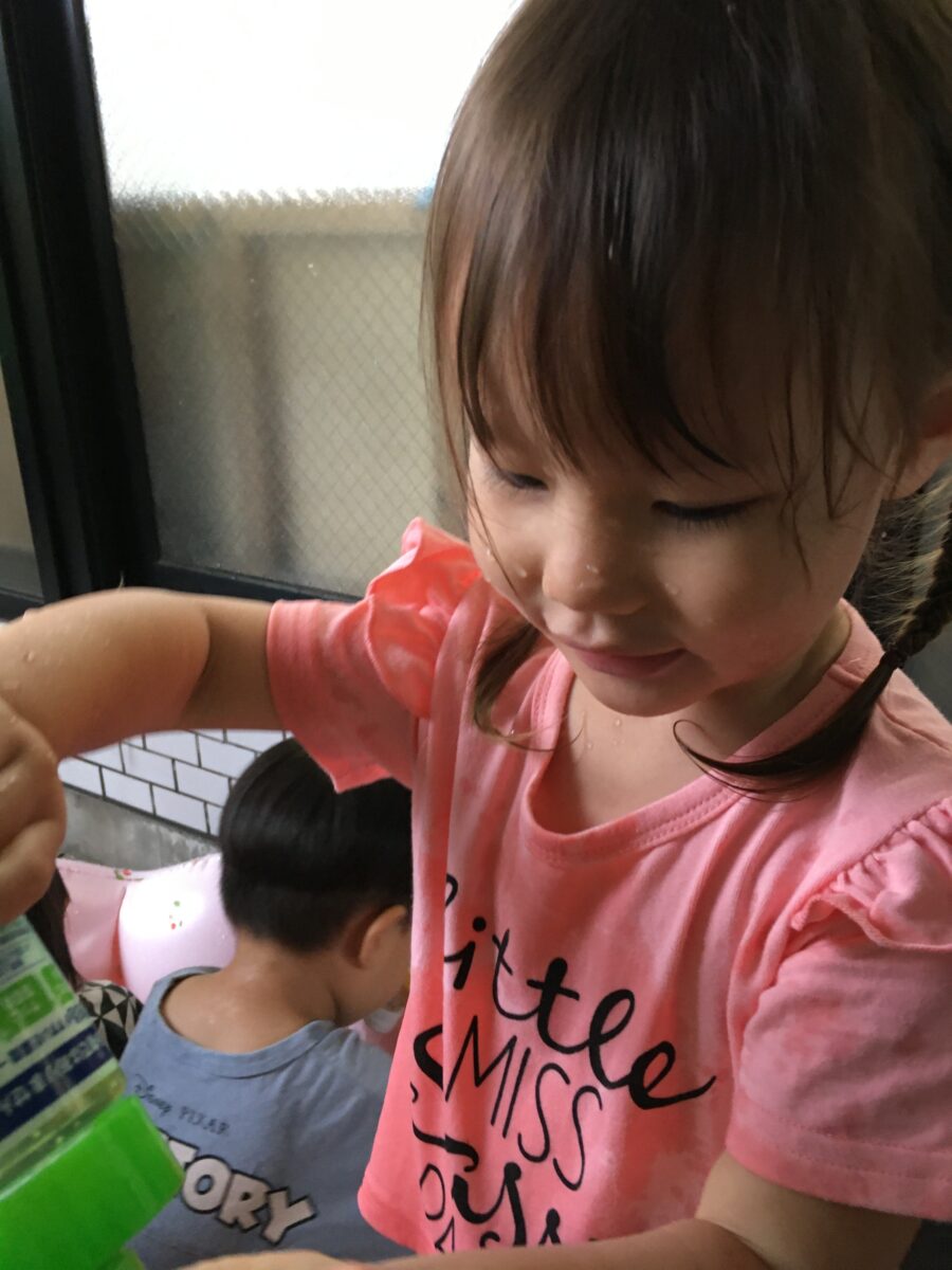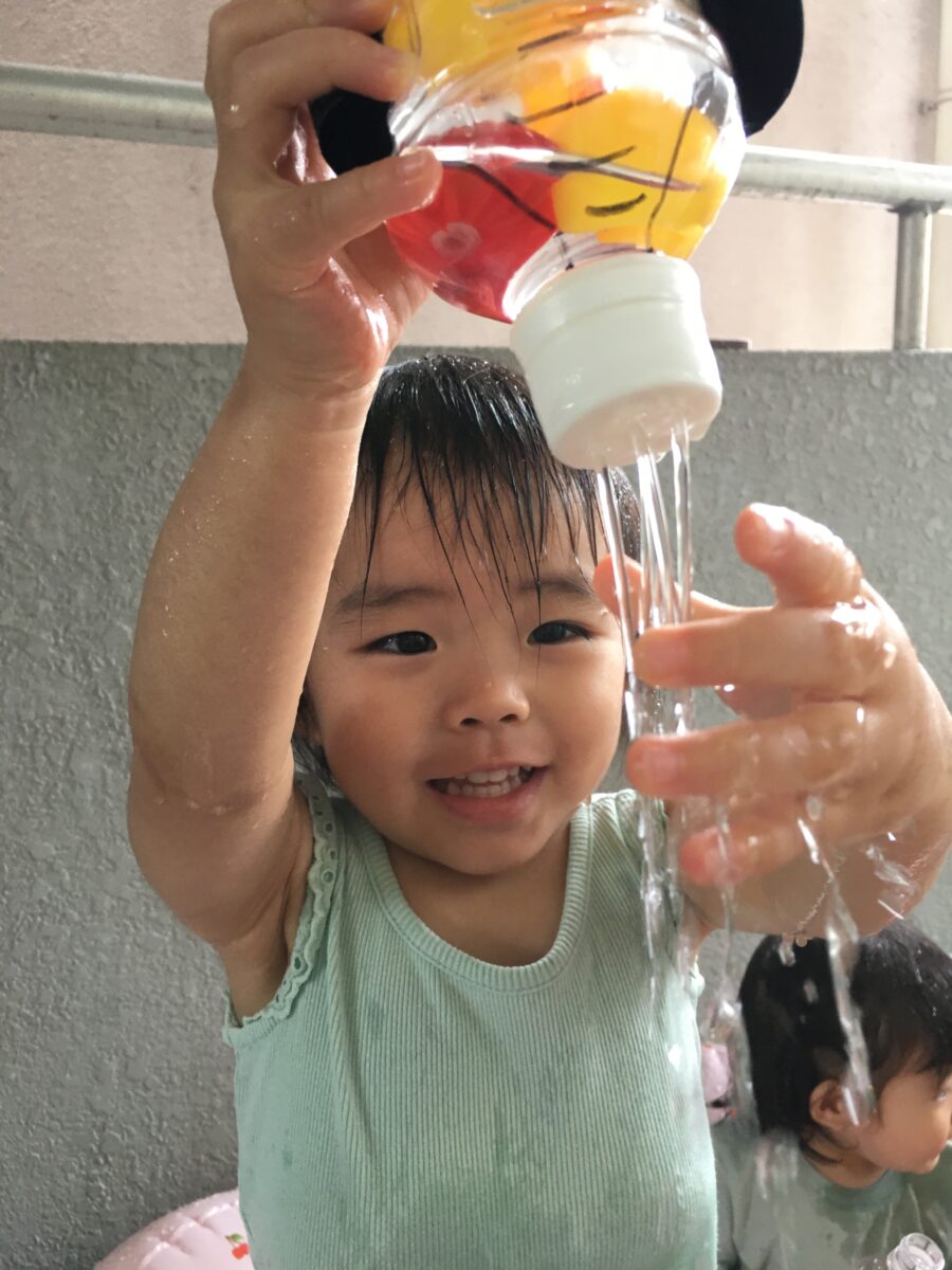 おもちゃを使ったり、シャワーから出る水を直接手で触ったりして思う存分に水遊びを楽しんでいました😃