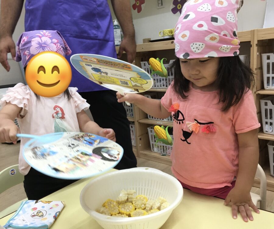 先生に茹でてもらってからは、みんなでうちわで扇いで、とうもろこしを冷ましました。