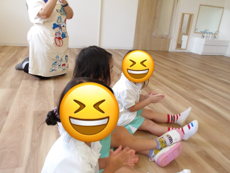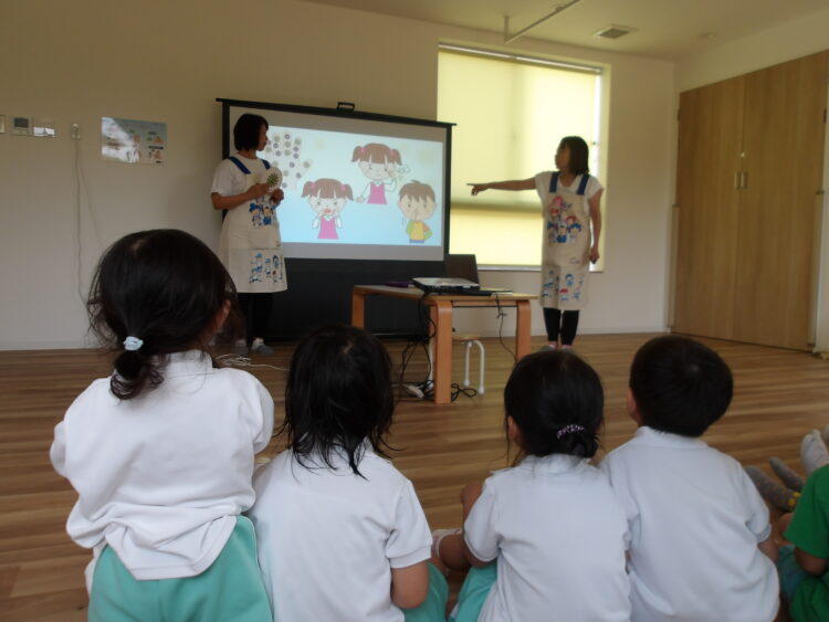 「どんな時に手を洗う?」と聞かれると、「ごはんー」と答えるお友だちも!「ご飯の前や、お外から帰ったときに、手を洗ってる人?」という質問には、「はーい!」と元気よく手を挙げて参加していましたよ。