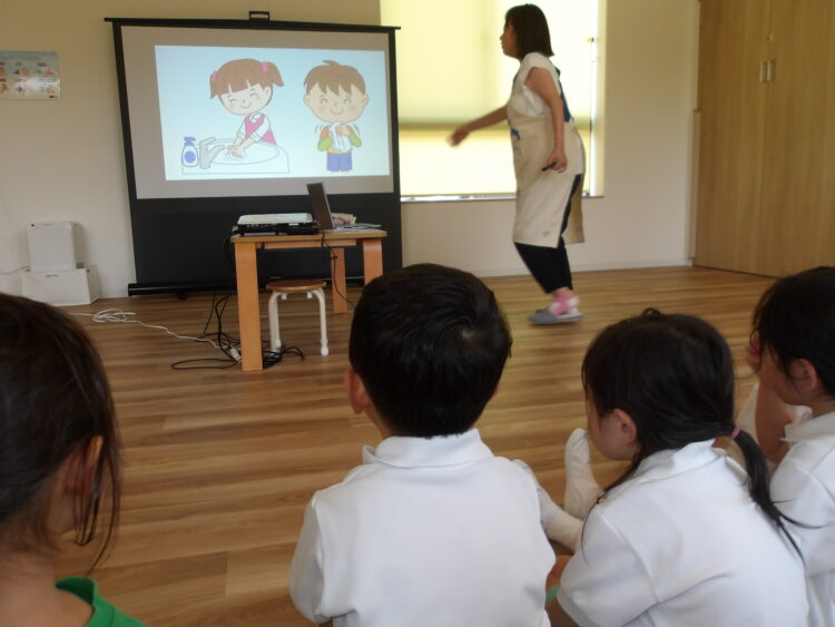 終始、映像や講師の方の話を真剣に聞き、手洗いの仕方を真似しながら聞いていました。