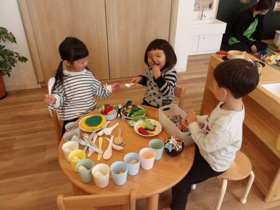 「みんなで一緒にいただきますしよ!」と楽しそうにおままごとが展開されていました✨