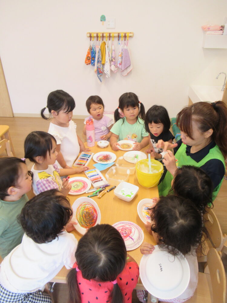 紙皿を使って作りましたが、みんな「ピザができたよー🎵」と嬉しそうな子供たち。「ピザじゃなくて七夕だよお〜💦」と話しましたが、少し難しかったようです😆