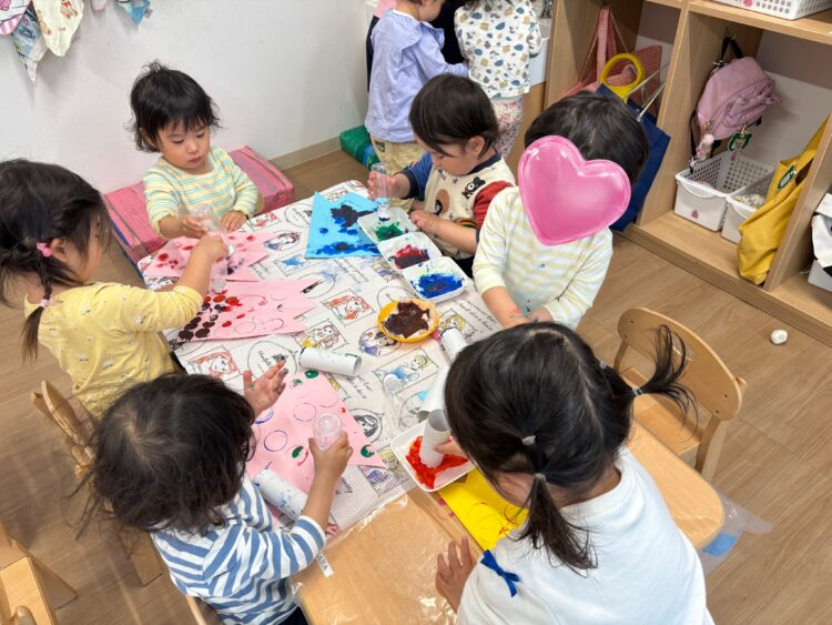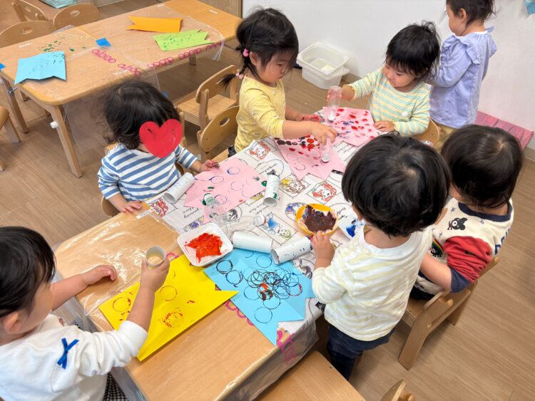 今日は、みんなで絵の具を使ってタンプ遊びしました😊ずっと、ペタペタしてる子もいれば、もう終わりーと言う子もいて、みんなそれぞれでした😊