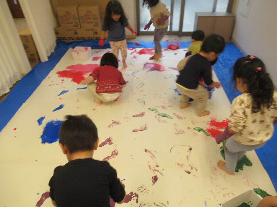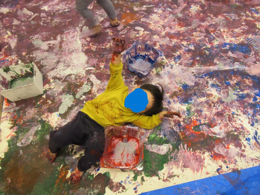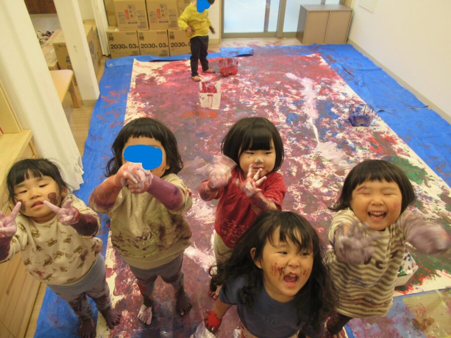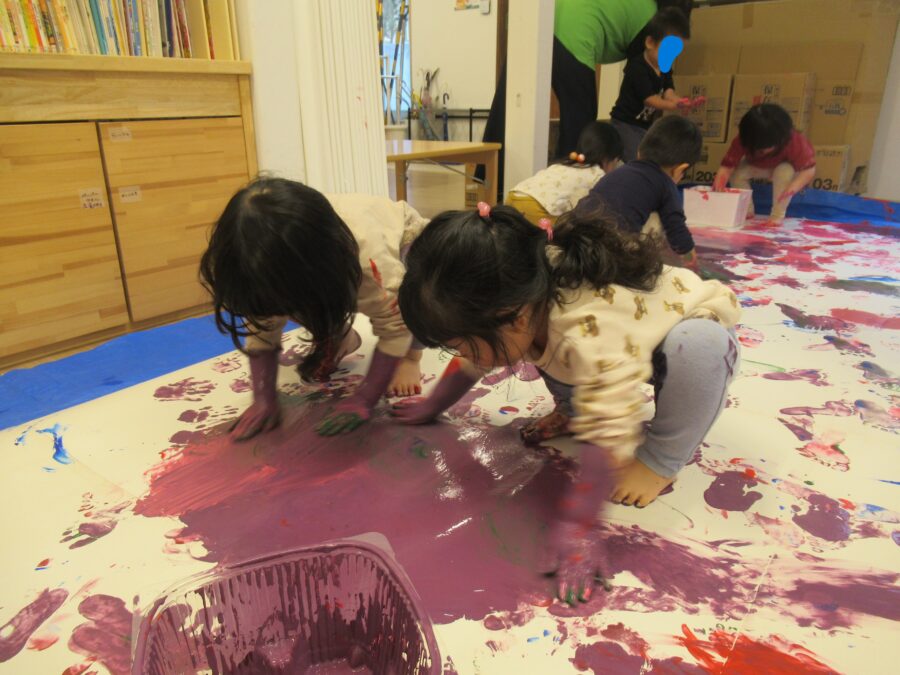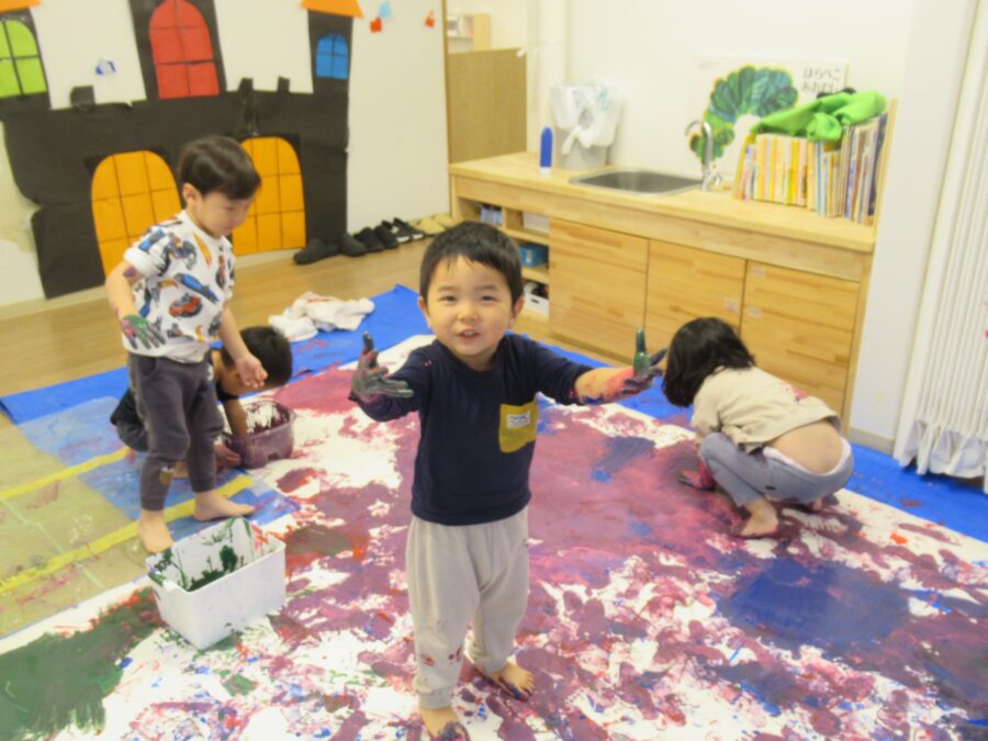 今日は絵の具を使って大きな紙にペインティングしました![]()