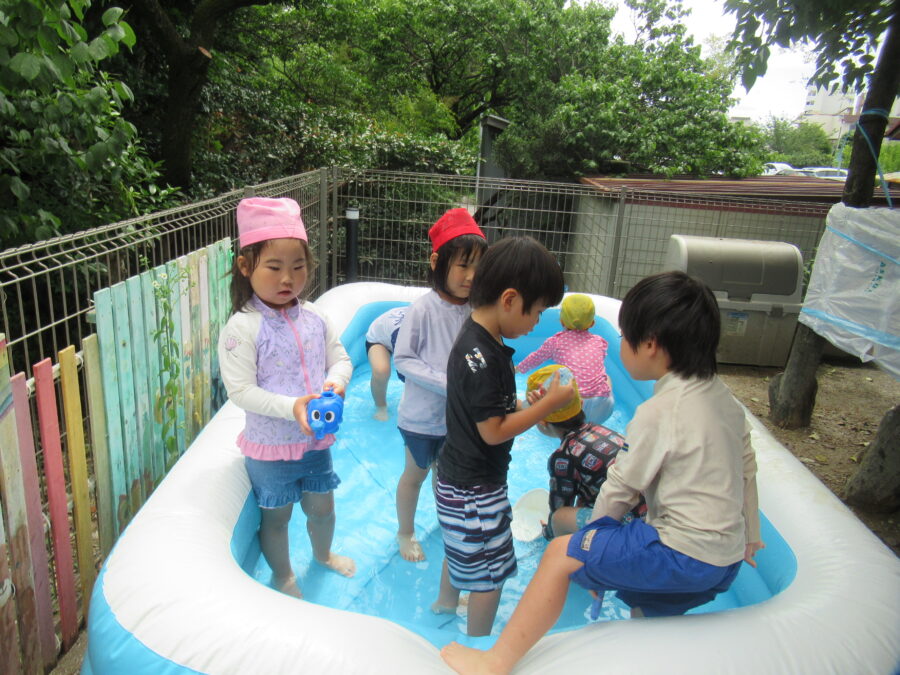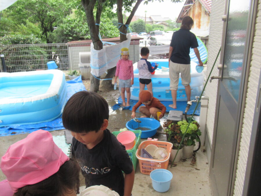 今日は、おひさまが出ていなかったので、水遊びをしました。