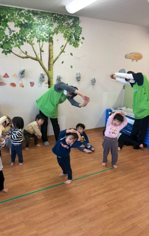 「手を上に挙げて〜身体をたおしまーす」